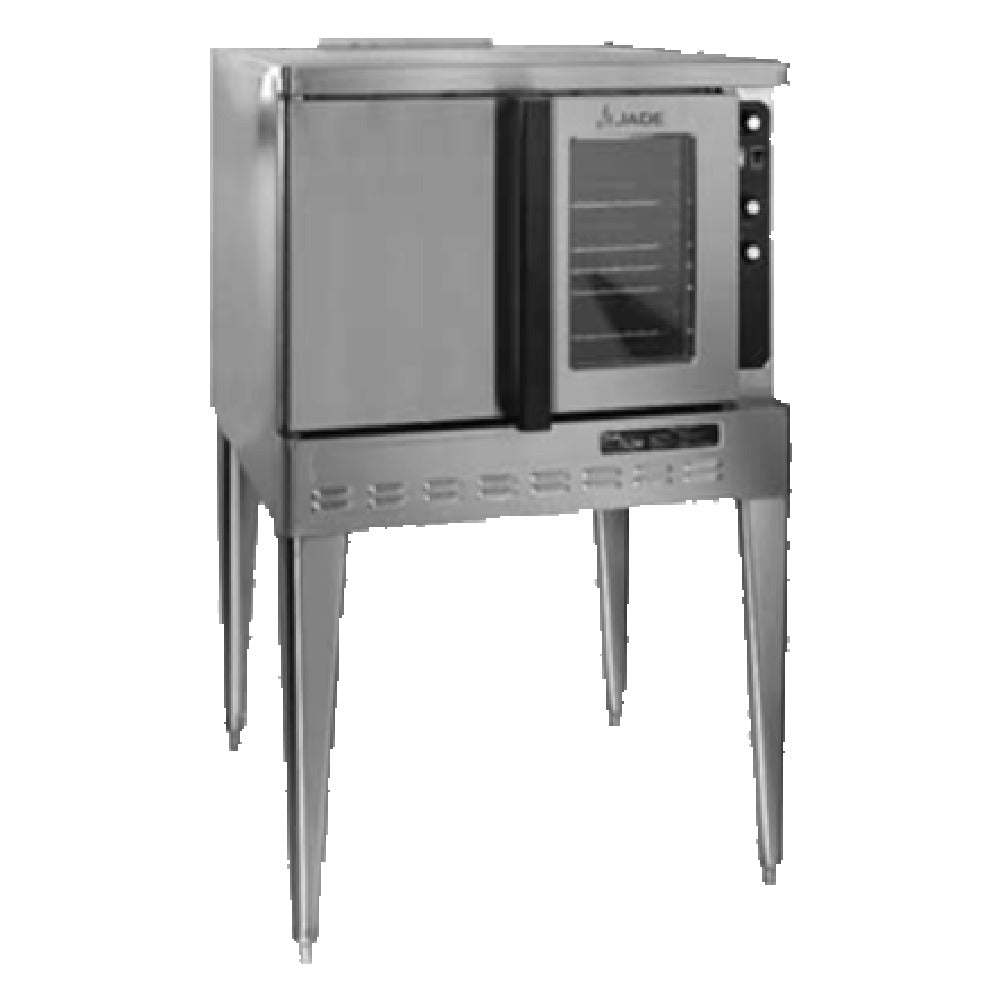 The Jade Range JCO-40B_LP Titan™ Convection Oven Full Size Gas is a high-performance cooking appliance designed for commercial kitchens. This single-deck convection oven operates on gas with an impressive output of 60,000 BTU, making it suitable for high-demand cooking environments. It features an electronic ignition and a solid-state thermostat with a wide temperature range from 140°F to 500°F, providing precise cooking control. The oven is equipped with a 60-minute timer and a 2-speed fan motor, enhancing its versatility and efficiency. Inside, it offers five chrome-plated racks and eleven position rack guides, allowing for flexible cooking configurations. The interior lights and split doors, with one solid door and one with a window, offer easy monitoring of the cooking process. Constructed with a durable stainless steel front, sides, and top, and supported by 25-inch adjustable legs with an undershelf, the oven is built to withstand rigorous use. Certified by CSAus and NSF, the Jade Range JCO-40B_LP ensures compliance with safety and sanitation standards, making it an invaluable asset for restaurants, bakeries, and catering services looking to enhance their culinary operations with reliable and efficient equipment.