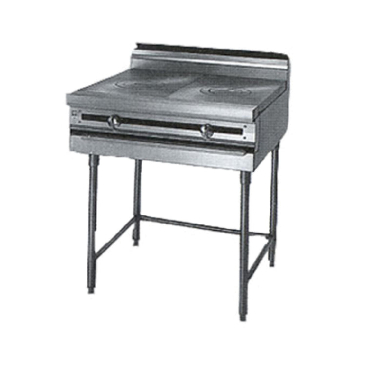 The Jade Range JMRH-2FHT_LP Titan™ Heavy Duty Range - gas - 36" is a modular kitchen appliance designed for professional culinary environments that demand high performance and durability. This heavy-duty range features two 18" French hot tops, offering versatile cooking capabilities with precise temperature control, thanks to its infinite control settings. It is powered by 60,000 BTU, providing ample heating power for various cooking tasks. The range is constructed with stainless steel on the front, sides, and stub back, ensuring longevity and resistance to the wear and tear of daily use. An added 6" stainless steel plate shelf enhances functionality by offering additional space for storage or preparation. The Jade Range JMRH-2FHT_LP Titan™ is CSAus and NSF certified, validating its adherence to stringent safety and sanitation standards. This range is ideal for a broad range of food service sectors, including restaurants, catering businesses, and large-scale food production facilities, where reliability, robust performance, and professional quality are paramount.