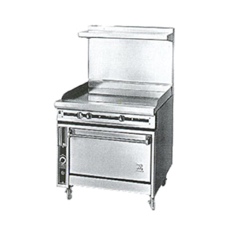 The Jade Range JTRH-36GT-36C_NAT Titan™ Heavy Duty Range is a versatile 36-inch gas range designed to meet the demanding needs of professional kitchens. It features a robust griddle with a 1-inch thick polished steel plate, equipped with precise thermostatic controls, ensuring consistent and reliable cooking results. Complementing the griddle is a convection oven with two chrome-plated oven racks, providing ample cooking space and versatility. The oven's interior is lined with stainless steel, enhancing durability and ease of cleaning, while a grease trough and splashguards help maintain a tidy cooking environment. The range is designed with practicality in mind, featuring a 6-inch plate shelf and adjustable legs for customized height. With a power output of 120,000 BTU and electrical requirements of 115v/60/1-ph and 4.4 amps, the range efficiently meets high-volume cooking demands. Its CSAus and NSF certifications underscore its adherence to stringent safety and health standards. Built with a sturdy front, sides, stub back, and bottom, this range is engineered for heavy-duty use, making it an ideal choice for chefs in high-traffic commercial kitchens, offering exceptional performance and durability.