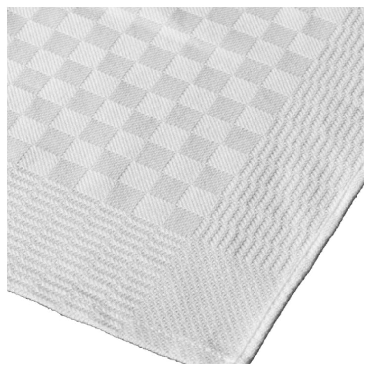 The JB Prince A300 W5 Side Towel is a practical and versatile accessory, measuring 25-1/2 inches in length and 17-3/4 inches in width, making it suitable for various culinary environments. This towel features a distinctive checkered pattern with a striped border, adding a touch of elegance and functionality to its design. Crafted from 100% cotton, it offers superior absorbency and durability, ensuring it withstands the rigorous demands of busy kitchens. The towel's quality cotton construction makes it ideal for chefs and kitchen staff who require reliable and efficient drying tools. Available in a pack of five, the JB Prince A300 W5 Side Towel is designed to meet the high standards of the food service industry, providing ample supply for continuous use. Its classic white color enhances its professional appearance, while the textured pattern offers a firm grip, essential for handling hot cookware and food items safely. These side towels are an excellent choice for restaurants, catering services, and home kitchens alike, where functionality and style are paramount. The JB Prince A300 W5 Side Towel represents a blend of practicality and aesthetic appeal, tailored to meet the needs of diverse culinary professionals.