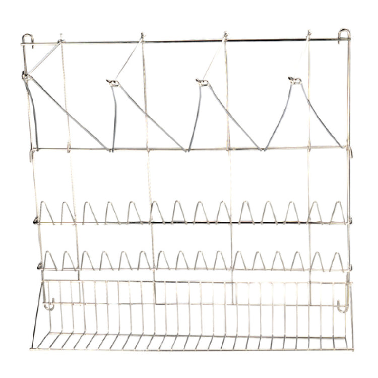 The JB Prince B703 Baker's Drying Rack is a meticulously designed culinary tool, sized at 21" x 18", specifically crafted to enhance the efficiency and organization within professional kitchens. This drying rack is engineered to hold up to 4 bags and accommodate 28 tips, making it an essential item for bakers and pastry chefs who require a reliable solution for drying and storing piping bags and tips. Constructed with rustproof wire, the rack is further enhanced with a durable vinyl coating in a classic white finish, ensuring longevity and resistance to corrosion in high-moisture environments. Its robust construction and practical design make the JB Prince B703 Baker's Drying Rack a valuable asset for various market segments within the baking industry, from artisanal bakeries to large-scale pastry operations. The thoughtful engineering of this drying rack not only supports the efficient use of space but also ensures hygiene standards are maintained, which is crucial in professional food preparation settings. The JB Prince B703 Baker's Drying Rack combines functionality with durability, providing an indispensable tool for culinary professionals seeking reliable and long-lasting kitchen equipment.