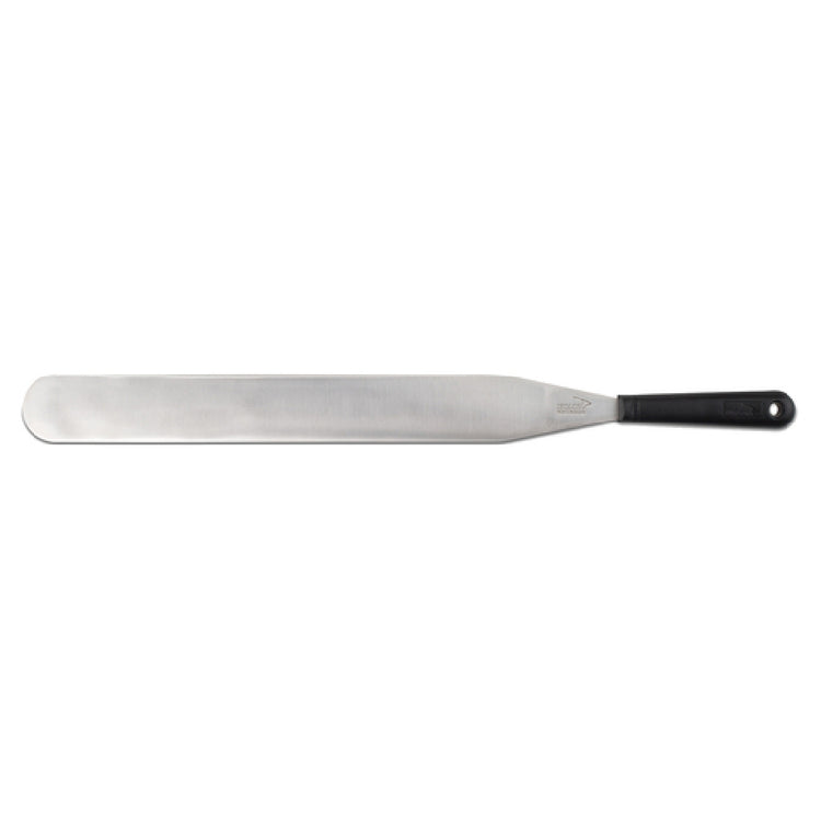 The JB Prince B970 40 Deglon Spatula is a versatile kitchen tool designed for precision and efficiency, featuring a 15-1/2-inch flexible stainless steel blade with an overall length of 20 inches. This spatula is an essential tool in culinary environments, where its flexibility and sturdy construction provide superior control for a variety of cooking and baking tasks. The stainless steel blade ensures durability, resisting rust and corrosion while maintaining a sharp edge for seamless application in any kitchen setting. The black plastic handle offers a comfortable grip, enhancing safety and reducing hand fatigue during extended use, making it a reliable choice for both professional chefs and home cooks. The JB Prince B970 40 Deglon Spatula’s well-balanced design and high-quality materials cater to various market segments, from large-scale restaurant kitchens to artisan bakeries, emphasizing its adaptability and utility. Whether used for flipping delicate fish fillets or spreading frosting on cakes, this spatula combines practicality with robust performance, reflecting JB Prince's commitment to delivering top-tier kitchen tools. It stands as a testament to thoughtful engineering, perfectly suited to meet the demands of culinary experts who prioritize precision and durability in their craft.