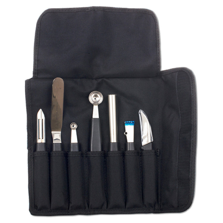 The JB Prince D341 Garde Manger Set is a comprehensive toolkit designed for culinary professionals who demand precision and versatility in food preparation. This set includes meticulously crafted stainless steel pieces, each with ergonomic black handles for ease of use and durability. The mini vegetable scoop features a precise 10mm diameter, ideal for creating uniform presentations. Complementing this is a double vegetable scoop with sizes of 22mm and 25mm, providing flexibility for various culinary tasks. The butter curler is designed to effortlessly create decorative butter curls, enhancing plating aesthetics. It also includes an apple corer, perfect for efficiently removing apple cores without damaging the fruit, and a lemon zester, which is essential for adding fine zest from citrus peels to dishes. The lemon decorator adds a visual flair to citrus garnishes, enhancing the dish's overall presentation. All tools are neatly organized in a black nylon roll, offering convenience and protection for transport and storage. This set is ideal for both professional chefs and culinary enthusiasts who aspire to elevate their plating techniques, making it a valuable addition to any kitchen environment focused on precision and artistic presentation.