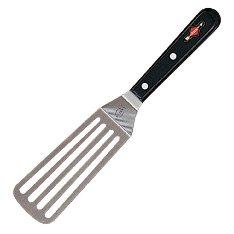 JB Prince D977 F. Dick Turner 5" x 2" Small is a precision-engineered tool designed for professionals demanding high-quality kitchen equipment. This slotted turner, measuring 5 inches by 2 inches, is crafted from stainless steel, ensuring durability and resistance to corrosion over time, making it a reliable choice for culinary tasks. The handle is made of polypropylene, a material known for its robust nature and resistance to heat and chemicals, providing a comfortable grip and ensuring safety during use. The sleek black handle adds a touch of elegance, complementing its functional design. The slotted feature of the turner facilitates efficient drainage of excess liquids, oils, or fats, enhancing the quality of your culinary creations. This versatile tool is particularly suited for small-scale, precise tasks within professional kitchens, catering services, and home cooking environments where attention to detail and quality material are paramount. Whether flipping delicate fish fillets or handling small pastries, the JB Prince D977 F. Dick Turner 5" x 2" Small offers a uniquely valuable addition to any kitchen lineup, balancing ergonomic comfort with practical functionality for a wide range of culinary applications.