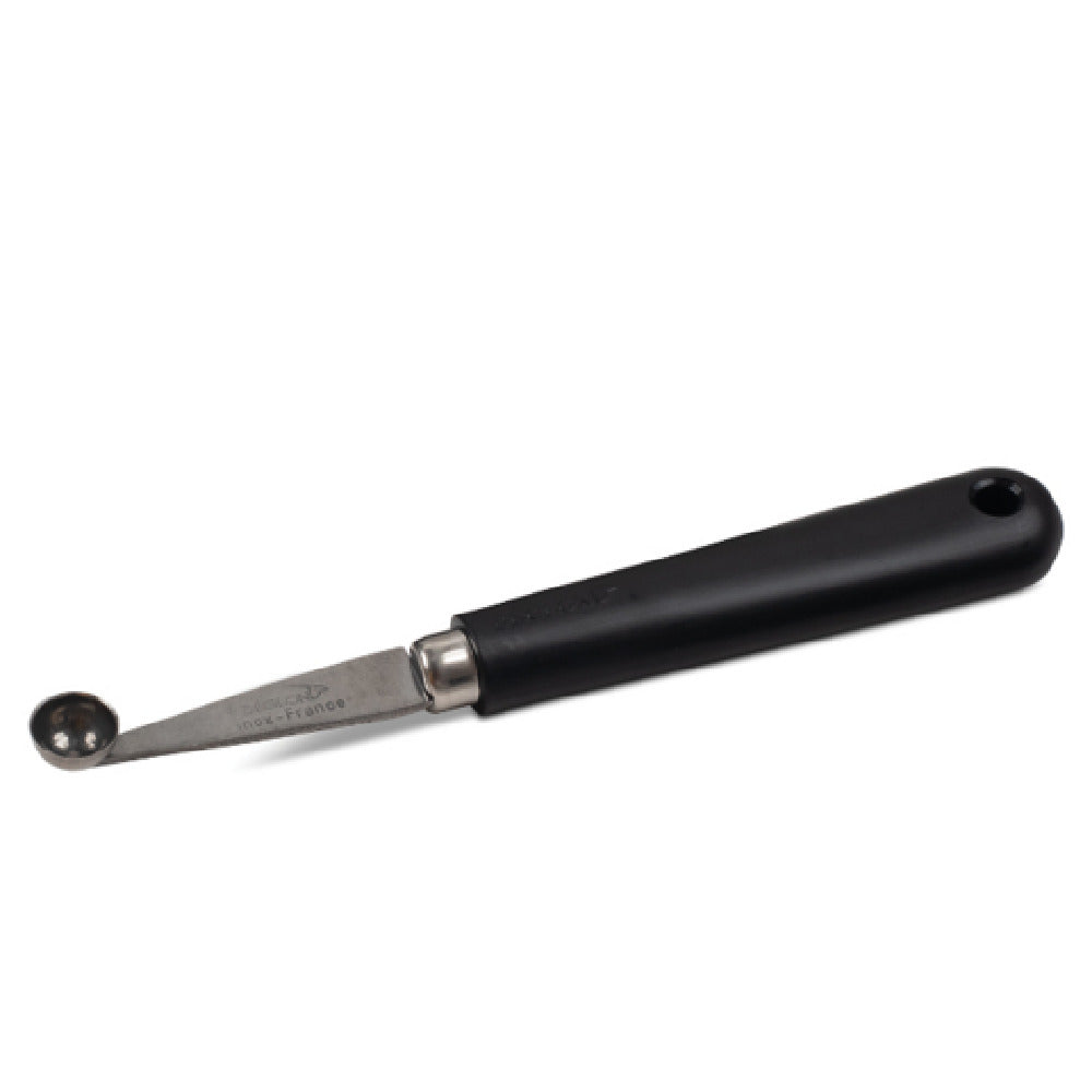 The JB Prince D987 Melon Baller - 13mm Dia. Stainless Steel is an exemplary tool designed for both professional chefs and home cooking enthusiasts who seek precision and durability in their culinary tasks. This melon baller features a 13mm diameter, making it ideal for creating uniform, perfectly rounded melon balls for fruit salads, garnishes, and desserts. The stainless steel construction ensures long-lasting performance and resistance to rust and corrosion, making it a reliable addition to any kitchen utensil collection. Complementing its robust metal design, the melon baller is equipped with a black plastic handle that provides a comfortable, ergonomic grip, facilitating ease of use during extended periods of food preparation. The JB Prince D987 Melon Baller's combination of sleek stainless steel and a practical handle makes it a versatile tool not only for professional kitchens but also for home cooks looking to enhance their culinary presentations with professional flair. This product is a testament to JB Prince's commitment to high-quality kitchen tools, offering both form and functionality to users across different culinary segments.