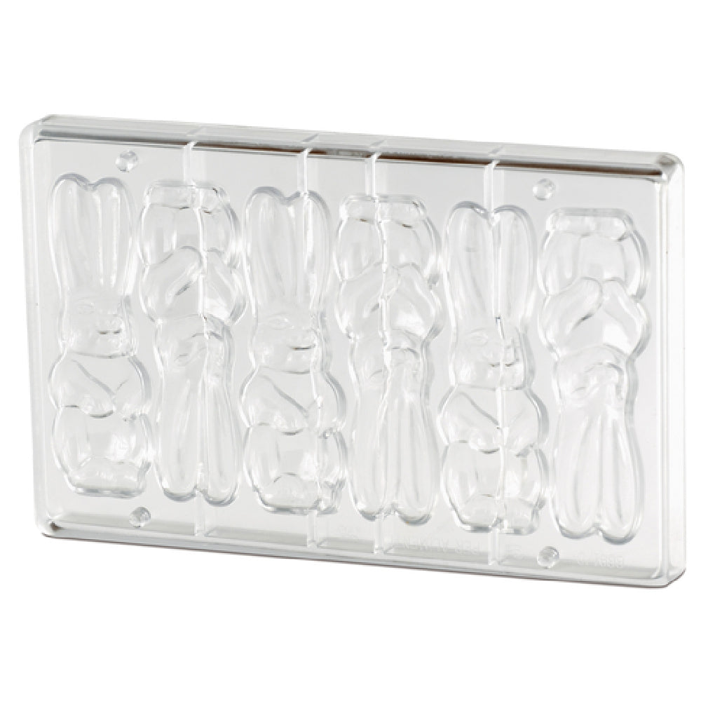 The JB Prince K832 Chocolate Mold is a versatile tool designed for culinary professionals seeking precision and creativity in their chocolate creations. This mold consists of six forms, each standing at a height of 3-1/2 inches, allowing for the crafting of detailed and impressive chocolate figures. With its two-piece design, this mold simplifies the process of releasing the chocolate, ensuring a smooth and professional finish. The motif of a big-eared rabbit adds a playful and imaginative element to chocolate designs, making it particularly appealing for seasonal or themed confections. Constructed from rigid polycarbonate, the mold is both durable and reliable, offering longevity and consistent results. Its opaque nature ensures that chocolate does not receive any unintended light exposure, preserving its quality and appearance. This product is ideal for chocolatiers, pastry chefs, and confectionery artists who prioritize quality and detailed design in their creations. The JB Prince K832 Chocolate Mold is a valuable addition to any professional kitchen, enabling the production of high-quality, visually appealing chocolate pieces that captivate and delight. Its blend of durability, ease of use, and creative potential makes it a standout choice for diverse market segments within the confectionery industry.