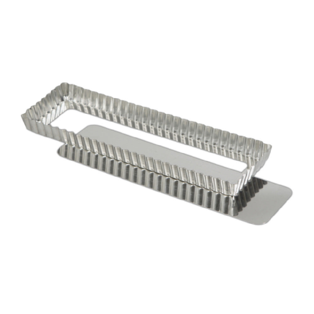 The JB Prince M257 Tart Mold is a meticulously designed baking tool, measuring 13-3/4 inches in length and 4-1/2 inches in width, crafted to cater to the precise needs of baking professionals and enthusiasts alike. This rectangular tart mold is notable for its removable bottom, a feature that facilitates the easy release of delicate pastries without compromising their integrity or appearance. Constructed from tinned steel, the JB Prince M257 Tart Mold ensures even heat distribution for consistent baking results, enhancing the quality of the final product. Its sturdy construction and material choice reflect a commitment to durability and longevity, making it an excellent investment for both commercial and personal kitchens. The mold's dimensions are particularly suited to creating elegant, elongated tarts that are ideal for upscale dining presentations or sophisticated home gatherings. This product's unique combination of size, material, and practical design elements positions it as a valuable asset for pastry chefs aiming to elevate their culinary creations, providing both aesthetic and functional benefits in the culinary arts industry.