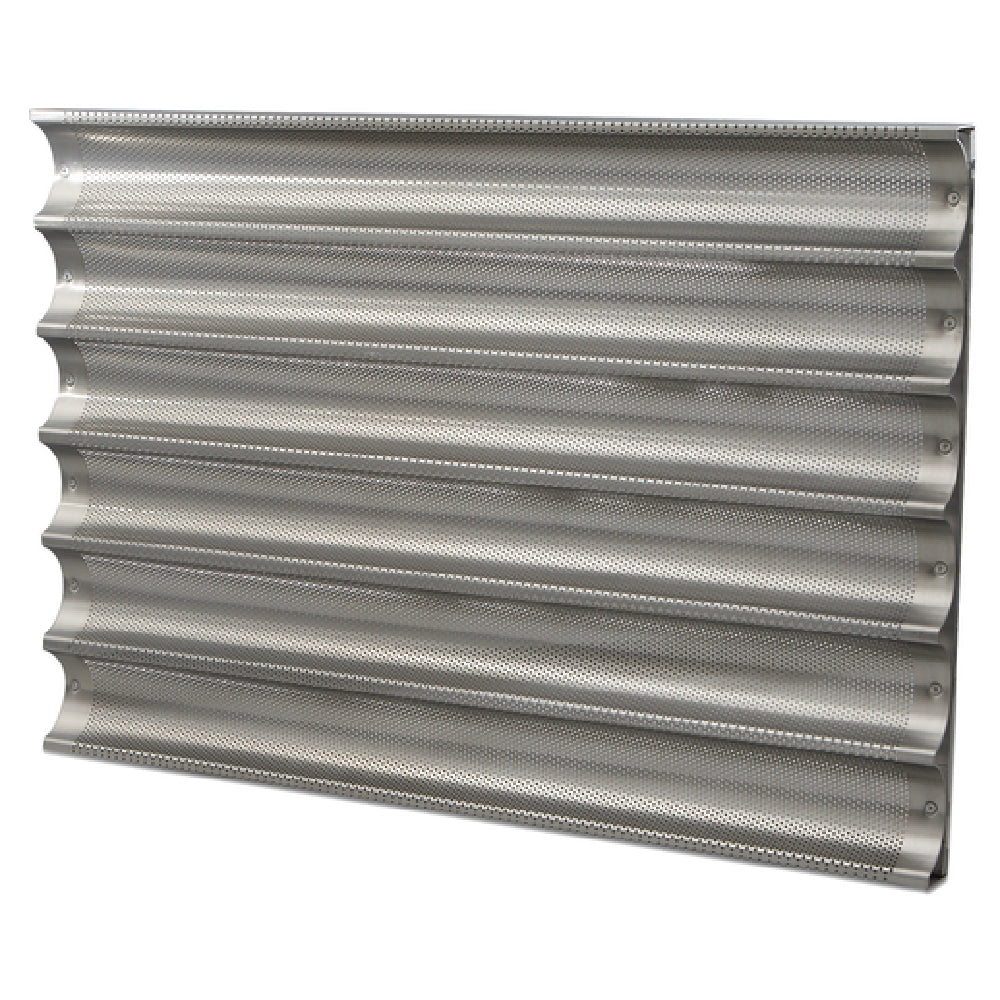 The JB Prince M505 French Bread Pan 26"L x 18"W (6) Loaf is a specialized baking tool expertly crafted for professional bakers and pastry chefs who demand precision and quality in their baked goods. This pan is designed to accommodate six loaves simultaneously, with each loaf measuring 26" x 2-1/2". Its perforated aluminum construction ensures even heat distribution and optimal airflow, resulting in perfectly baked French bread with crisp, golden crusts. The 26-inch length and 18-inch width provide ample space for producing multiple loaves, making it an efficient choice for high-volume baking environments. The pan's durable aluminum structure is both lightweight and resistant to warping, ensuring longevity and consistent performance in commercial kitchens. The JB Prince M505 is ideal for artisan bakeries, catering operations, and educational institutions where high-quality bread production is a priority. Its thoughtful design and material selection make it a valuable tool for those in the food service industry seeking reliable baking solutions to meet diverse customer demands. With its emphasis on functionality and quality, this French bread pan stands out as a key asset for any professional seeking excellence in bread-making.