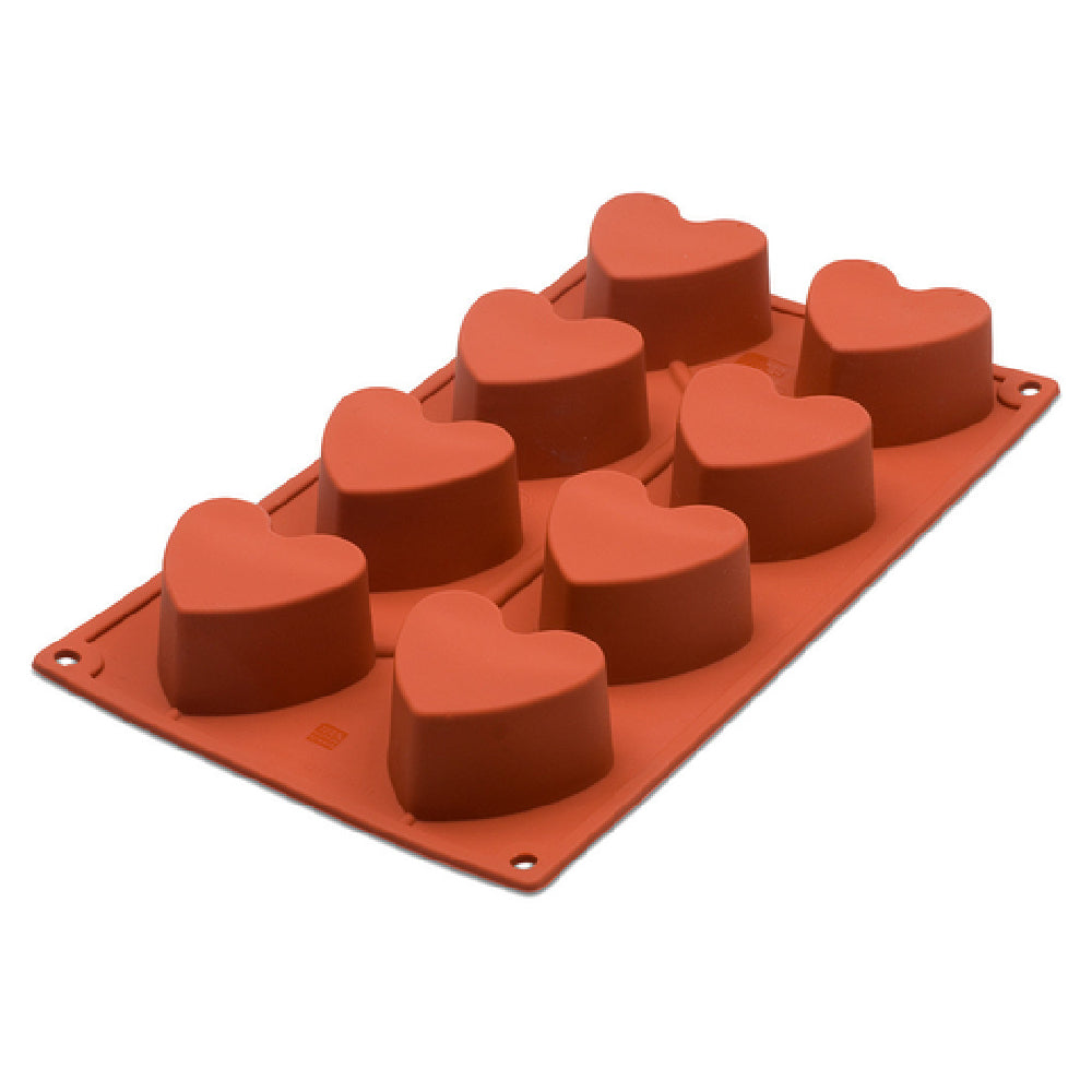 The JB Prince M510 W Pavoni Mold is a versatile and essential tool for professional kitchens and bakeries, offering precision and quality in confectionery and dessert creation. This mold measures 12 inches in length and 7 inches in width and features eight heart-shaped cavities, each with dimensions of 2-1/2 inches in width and 1-1/3 inches in height, accommodating a capacity of 2 ounces per cavity. Its design emphasizes durability and flexibility, crafted from high-quality orange silicone, which ensures a non-stick surface for easy release of molded creations. The mold's impressive temperature range of -10°F to +500°F makes it suitable for both freezing and baking applications, providing versatility across various culinary tasks. Additionally, it is dishwasher safe, which simplifies the cleaning process, enhancing its practicality for daily professional use. The JB Prince M510 W Pavoni Mold is particularly valuable for pastry chefs and chocolatiers looking to produce consistent, aesthetically pleasing heart-shaped desserts or decorations, whether for large-scale production or bespoke culinary presentations. Its reliable performance and ease of use make it a must-have for culinary professionals who value precision and quality in their craft.