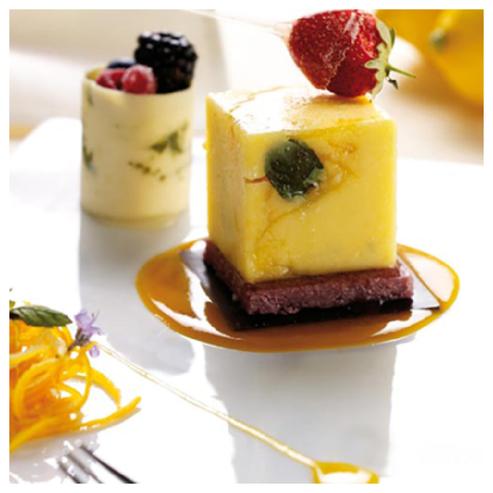 The JB Prince M512 E Pavoni Mold is a meticulously crafted kitchen tool, measuring 12 inches in length and 7 inches in width, designed to produce eight distinct cubes with precision. Each cube measures 2 inches in square dimension and 2 inches in height, offering a 4-ounce capacity, ideal for culinary creations that require exact portion sizes. This mold operates efficiently within a wide temperature range of -10°F to +500°F, showcasing its adaptability for both frozen and baked goods. Its non-stick and flexible silicone construction ensures easy release of molded items, minimizing the risk of breakage or deformation, making it a reliable choice for professional bakers and chefs. The mold's vibrant orange hue adds a touch of color to the kitchen environment while being completely dishwasher safe, allowing for straightforward cleaning and maintenance. This Pavoni mold caters to various industry segments, including artisanal patisseries focusing on bespoke confections and large-scale food production facilities requiring uniformity and consistency. Its durable silicone build ensures longevity and repeated usability, offering a valuable asset for culinary professionals seeking precision and efficiency in their production process. The JB Prince M512 E Pavoni Mold perfectly combines functionality and versatility, meeting the diverse needs of its users.