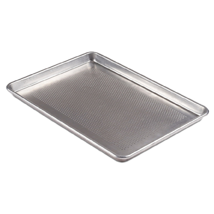 The JB Prince M542 Sheet Pan Half Sheet 12-7/8" X 17-3/4" is a versatile baking tool tailored for both professional kitchens and home bakers. This half sheet pan is crafted from 18 gauge aluminum, which is known for its excellent heat conductivity, ensuring even baking and browning of your culinary creations. The pan's dimensions of 12-7/8 inches by 17-3/4 inches offer ample space for an array of baking needs, from pastries to savory dishes. Unique to this model is its perforated design, which promotes enhanced air circulation, contributing to crispier results, particularly for items like pastries and roasted vegetables. The natural finish of the aluminum not only adds to its aesthetic appeal but also makes it easy to clean, maintaining its pristine condition over time. Ideal for restaurants, bakeries, and catering services, the JB Prince M542 Sheet Pan is a reliable choice for those seeking durability and performance. Its precise construction supports consistent results, making it a staple in any food service operation. Whether you're baking cookies or roasting vegetables, this sheet pan's quality construction ensures it can withstand the demands of high-volume use, providing value and efficiency in a busy kitchen environment.