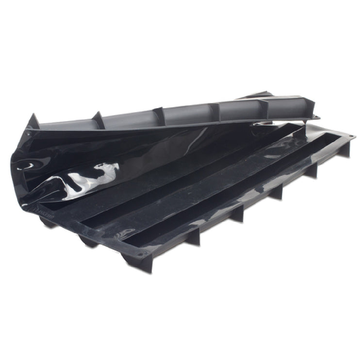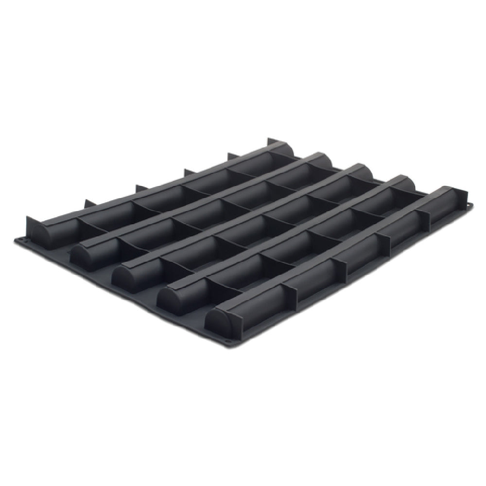 The JB Prince M619 F Pavoni Pavoflex Mold is a premium culinary tool, measuring 23-1/2 inches in length and 15-3/4 inches in width. It is designed to produce five distinct tronchetto mignon shapes, each with dimensions of 22 inches in length and a diameter of 1-9/16 inches, and a capacity of 20-3/10 ounces. This mold is crafted from non-stick, flexible silicone, ensuring easy release and cleaning. Its temperature range spans from -40 to 536 degrees Fahrenheit, making it versatile for various baking and freezing applications. The mold's sleek black color adds a professional touch to any kitchen setting. This product is ideal for professional chefs, bakers, and culinary enthusiasts seeking to create intricate desserts and pastries with precision. Its flexibility and temperature resilience make it suitable for diverse culinary environments, from high-heat ovens to cold freezers. The JB Prince M619 F Pavoni Pavoflex Mold stands out for its durability and performance, serving as a reliable asset in both commercial and home kitchens.