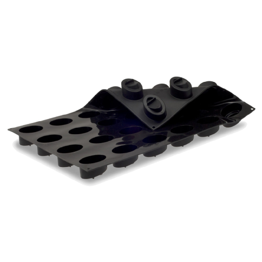 The JB Prince M620 K Pavoni Pavoflex Mold is meticulously crafted to meet diverse culinary requirements, featuring a dimension of 23-1/2"L x 15-3/4"W which accommodates 24 tilted ovals. Each oval measures 2-7/8"L x 2"W x 1-3/4"H and holds a capacity of 3-3/8 oz., making it ideal for precision in professional settings. This mold operates efficiently across a wide temperature range of -40 to 536°F, providing flexibility for various cooking and freezing applications. Constructed from non-stick, flexible silicone, it ensures ease of release and durability, enhancing the quality and consistency of the final product. The black color adds a sleek aesthetic, complementing modern kitchen environments. The JB Prince M620 K Pavoni Pavoflex Mold is particularly suited for pastry chefs, chocolatiers, and culinary professionals specializing in intricate food presentations, who require consistent results with an emphasis on both form and function. Its innovative design supports high-volume production while maintaining precision, catering to the needs of gourmet kitchens and artisanal food manufacturers looking to achieve high standards and efficiency in their creations.