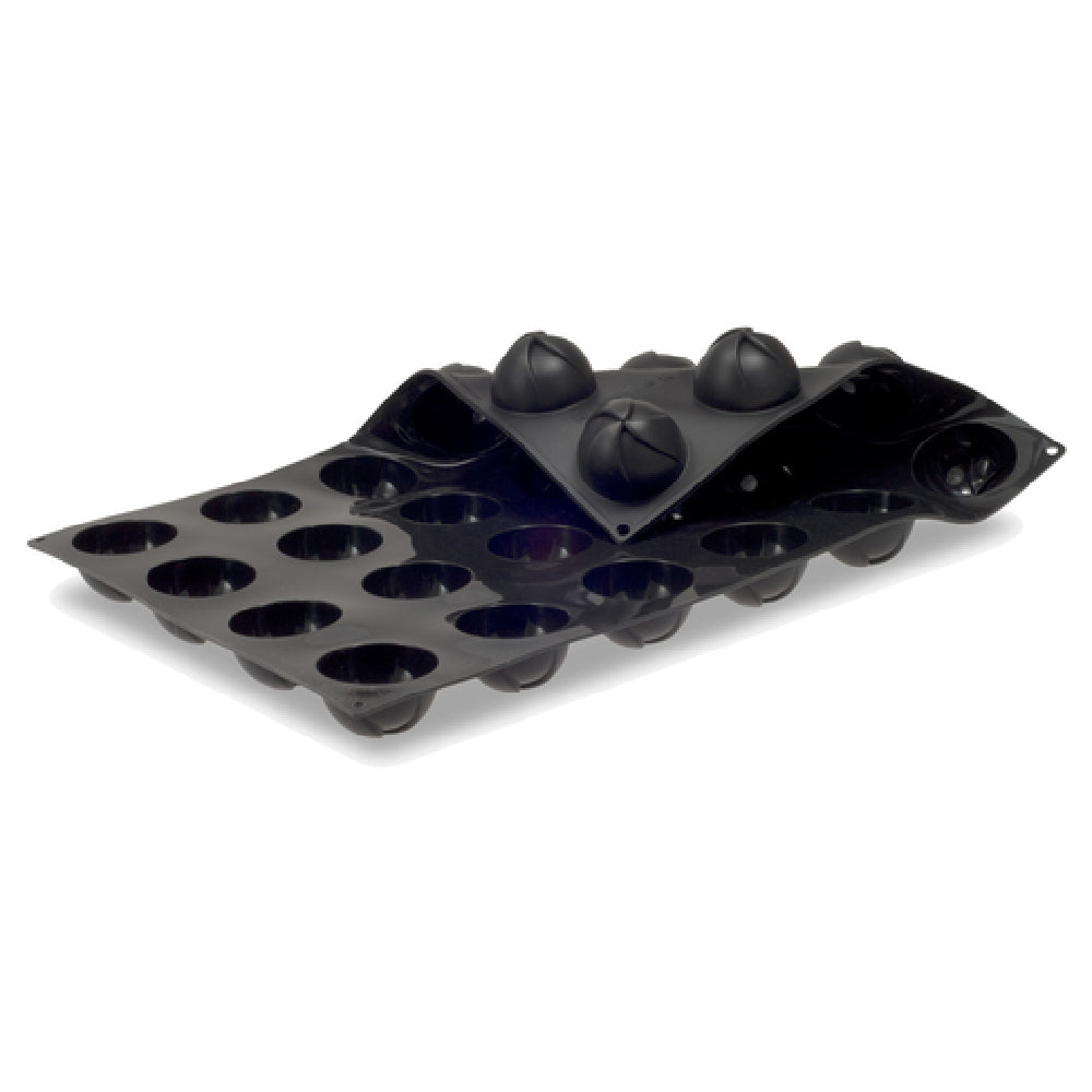 The JB Prince M620 L Pavoni Pavoflex Mold is an innovative tool designed for culinary professionals and enthusiasts seeking precision and creativity in their creations. Measuring 23-1/2 inches in length and 15-3/4 inches in width, this mold features 24 swirl dome cavities, each 2-3/4 inches long and 1-3/4 inches high, with a capacity of 3-3/4 ounces. Constructed from high-quality, non-stick, flexible silicone, this mold offers versatility and ease of use. Its temperature range of -40 to 536 degrees Fahrenheit makes it suitable for a wide array of applications, from freezing desserts to baking intricate pastries. The sleek black design not only provides a modern aesthetic but also enhances the visibility of the molded product, ensuring precise detailing. This mold is particularly valuable in professional kitchens, allowing chefs to produce consistent and high-quality results efficiently. Additionally, its flexibility aids in the easy release of delicate creations, minimizing damage and waste. Ideal for patisseries, catering services, and food artisans, the JB Prince M620 L Pavoni Pavoflex Mold combines functionality with durability, making it an indispensable asset in the culinary industry.
