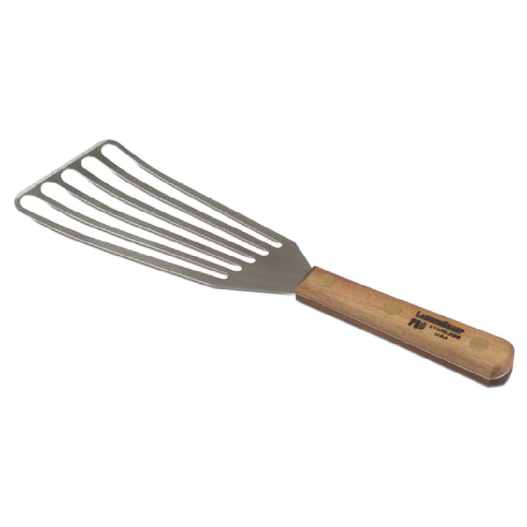 The JB Prince M844 Lamson Turner 6"L x 3"W Left Handed is a specialized kitchen tool designed for precision and efficiency, catering specifically to left-handed users. Crafted with a 6-inch by 3-inch stainless steel blade, this tool ensures durability and resistance to corrosion, suitable for rigorous use in both professional and home kitchens. The slotted blade design offers enhanced functionality by allowing liquids to drain efficiently during food preparation, making it an ideal choice for chefs and culinary enthusiasts focused on meticulous cooking techniques. The polypropylene handle, featured in a sleek black finish, provides a comfortable and secure grip, reducing hand fatigue during prolonged usage. This thoughtful design consideration enhances user experience, particularly for left-handed individuals who require ergonomic tools tailored to their needs. The JB Prince M844 Lamson Turner represents a merging of high-quality materials and user-centric design, making it a valuable asset in any culinary setting. Its robust construction and targeted functionality ensure it stands out in the kitchen tool market, offering a reliable and efficient solution for those seeking a specialized, left-handed culinary tool.