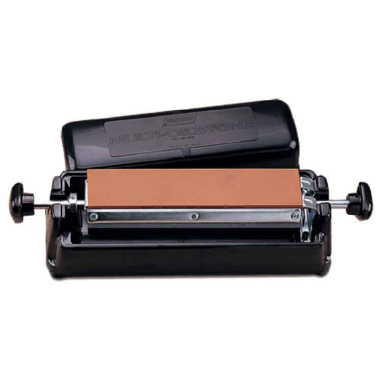 The JB Prince M902 Norton Oilstone features an 11-3/8"L x 2-1/2"W stone size and is a comprehensive sharpening solution that includes a 16 oz. bottle of mineral oil. This versatile oilstone is equipped with three grit stones - fine, medium, and coarse - catering to a variety of sharpening needs from precision honing to restoring edges on dull blades. The stone’s robust size and grit variability position it as an essential tool for professionals and enthusiasts in culinary, woodworking, and mechanical industries. The black and orange plastic casing not only provides a durable housing but also enhances portability and convenience. Each stone is designed to effectively manage different sharpening tasks, from creating a razor-sharp edge to smoothing out nicks and imperfections. The inclusion of mineral oil ensures that users have the necessary component to maintain the stone’s performance and longevity. This product is engineered for those who demand precision and efficiency, offering a reliable and consistent sharpening experience that supports a wide range of tools and implements. Its thoughtful design ensures it meets the needs of diverse market segments within the industry, providing a valued addition to any professional or home toolkit.