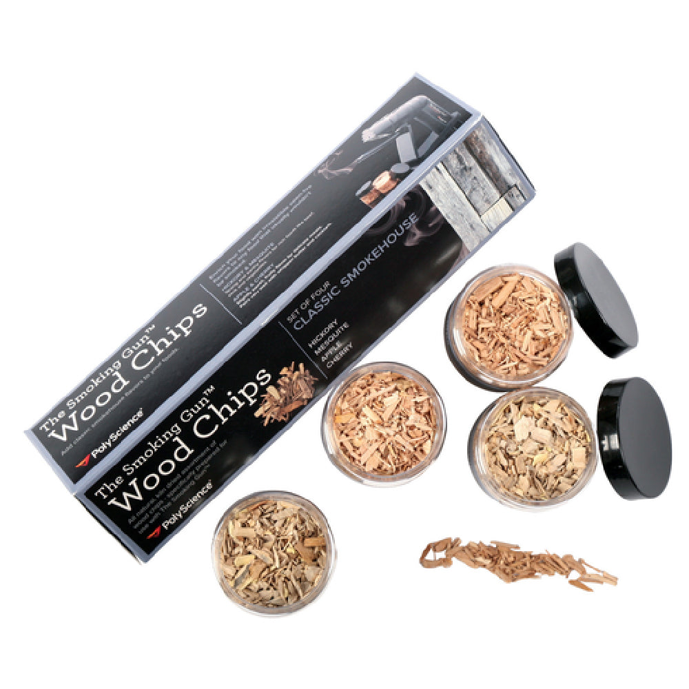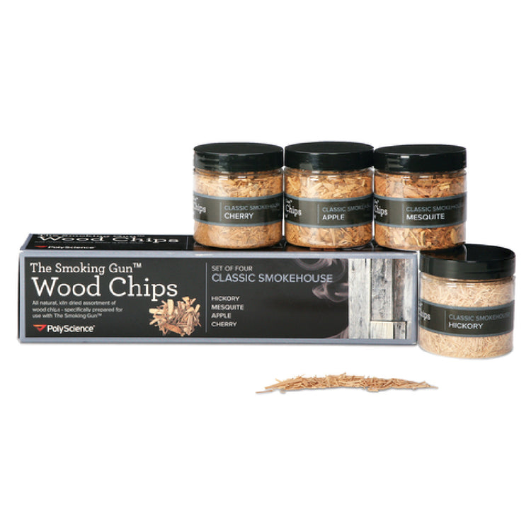 The JB Prince P386 SD Polyscience Wood Kit for handheld Smoking Gun smoker - 4 jars of wood chips (hickory, mesquite, applewood, and cherry) - is a specialized accessory designed for use with the model P386. This wood kit includes four distinct types of wood chips, each providing unique flavors to enhance culinary creations. Hickory, mesquite, applewood, and cherry chips allow chefs and home cooks to experiment with a variety of smoky profiles, catering to a diverse array of tastes and culinary styles. These wood chips are optimized for use with the handheld Smoking Gun smoker, adding versatility and depth to smoking techniques across different cooking environments. Ideal for both professional chefs and enthusiasts, the JB Prince P386 SD Polyscience Wood Kit offers an accessible means to infuse foods with rich, smoky flavors without the need for traditional smoking equipment. The compact jars ensure easy storage and handling, making them a practical addition to any kitchen setup where creativity in flavor is valued. This wood kit serves as a key component for those looking to elevate their smoking gun experience, providing a range of flavors to suit various dishes and culinary applications.