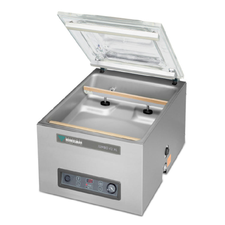 The JB Prince P454 Henkelman Jumbo 42XL II Chamber Vacuum Machine, made in the Netherlands, is a specialized piece of equipment designed for precision vacuum packaging needs across various sectors, including food processing and storage industries. This chamber vacuum machine combines advanced technology with robust construction, ensuring efficient and reliable performance. Hailing from the Netherlands, a country renowned for its engineering excellence, the P454 model ensures high-quality vacuum sealing, which is crucial for preserving the freshness and longevity of perishable products. Its spacious chamber design can accommodate larger items, making it suitable for both small and large-scale operations. The machine's technical specifications are tailored to meet rigorous industry demands, offering a versatile tool for maintaining product integrity during storage and transportation. The JB Prince P454 is ideally suited for businesses seeking efficiency and reliability in vacuum packaging, providing a vital solution in extending the shelf life of products while maintaining quality and nutritional value. This chamber vacuum machine stands out for its craftsmanship and precision, embodying the innovation and durability associated with Dutch manufacturing. Whether used in culinary establishments, food manufacturing, or packaging facilities, the JB Prince P454 Henkelman Jumbo 42XL II is a key asset for achieving superior vacuum sealing results.