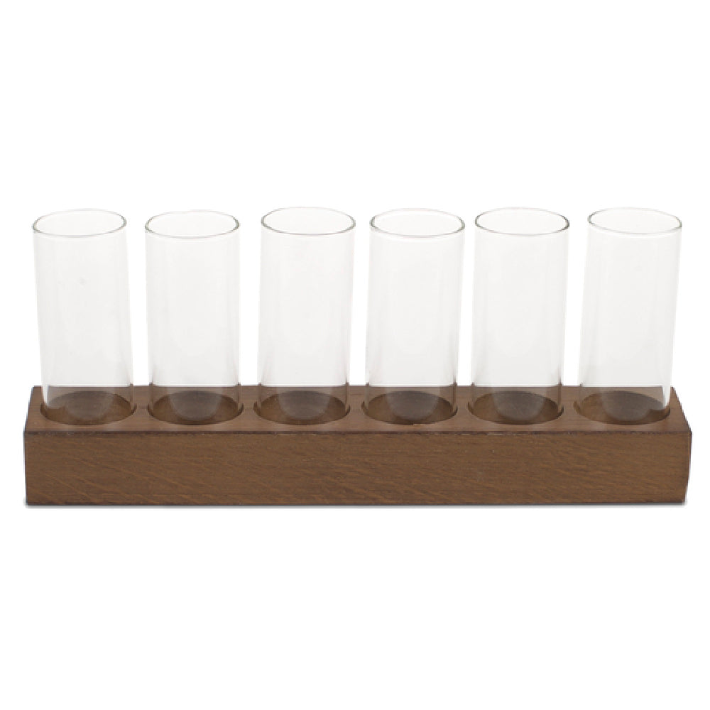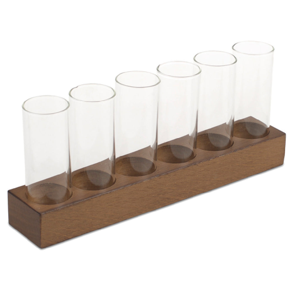 The JB Prince R1069 Cocktail Server is a meticulously crafted serving solution with dimensions of 9-1/2"L x 2"W x 3-1/4"H. This cocktail server features six cavities, each designed to hold 2.25 oz., providing an elegant and organized display for cocktail presentations. Constructed from high-quality column glass, the server complements its aesthetic with a sturdy brown wood base, balancing functionality and sophistication. The JB Prince R1069 is ideal for high-end bars, catering services, and event planners seeking a stylish way to present a variety of cocktails or other beverages. Its compact size and efficient design cater to venues with limited space but a demand for high impact presentations. The elegant combination of glass and wood makes it suitable not only for professional environments but also for upscale home entertaining, appealing to a diverse range of clientele in the food and beverage industry. This cocktail server stands out as a unique asset in any setting, combining aesthetic appeal with practical application, ensuring that each drink is served with style.