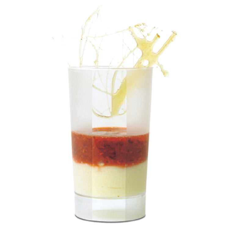 The JB Prince R484 2 Comatec Disposable Maxi Glass is a 5 oz. container designed for versatility and convenience across various industry sectors. Measuring 2 inches in diameter and 3-3/4 inches in height, this disposable glass offers a perfectly balanced size for single-serving portions, making it suitable for catering and food service applications. Crafted from durable plastic, it features a frosted and transparent finish that adds an elegant touch to its presentation. Each pack contains 300 units, ensuring ample supply for events, restaurants, or catering services. The JB Prince R484 2 Comatec glass is particularly valued in the hospitality and culinary industries for its practicality and aesthetic appeal, providing a sleek and functional solution for serving and presenting culinary creations. Its disposable nature eliminates the need for intensive cleaning, thus saving time and effort in fast-paced environments. The combination of size, material, and design makes this product an essential tool for professionals who require reliability and efficiency without compromising on visual appeal.