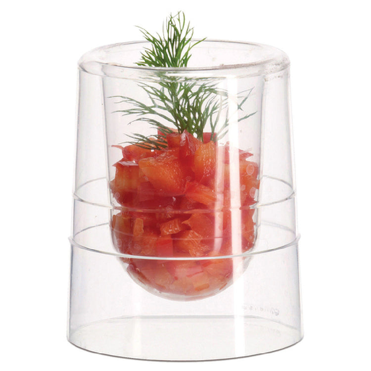 The JB Prince R532 Comatec Disposable Aperitif Glass is an expertly crafted solution for serving aperitifs in a convenient and stylish manner. With a capacity of 2-1/2 oz., this glass is designed to accommodate a perfect serving size for a variety of beverages, enhancing the presentation in any culinary setting. It features a compact structure with dimensions of 2 inches in diameter and a height of 2-1/2 inches, providing a substantial yet manageable size for easy handling and optimal space utilization. The double-walled construction of the glass not only contributes to its sturdy design but also offers superior insulation, maintaining the temperature of the contents for an enjoyable drinking experience. Made from transparent plastic, this disposable glass ensures both durability and elegance, allowing the visual appeal of the drink to shine through. Packaged in quantities of 200, this product is a practical choice for catering companies, hospitality venues, and event organizers looking to enhance service efficiency while maintaining aesthetic appeal. The JB Prince R532 Comatec Disposable Aperitif Glass seamlessly combines functionality and sophistication, making it an invaluable asset in professional culinary environments where quality presentation and convenience are paramount.