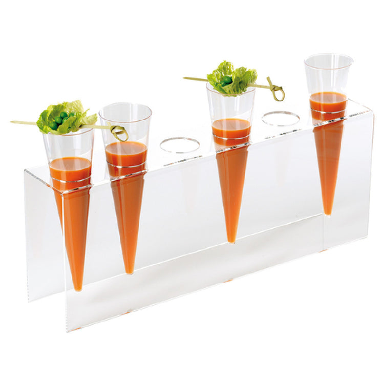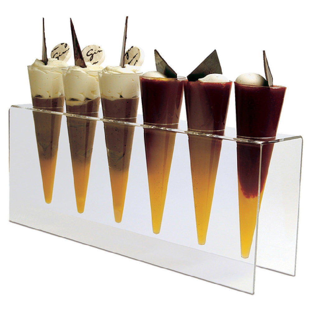 The JB Prince R535 Comatec Flute Stand is engineered for exceptional utility, featuring dimensions of 14 inches in length and 5-1/2 inches in height, making it an ideal choice for professional culinary environments that require organized and efficient presentation solutions. The stand is designed with 1-2/5 inch diameter openings, accommodating up to six flutes, specifically tailored for the R489 series, although these flutes are not included with the stand. Constructed from high-quality transparent plastic, this flute stand not only offers durability but also a sleek, modern aesthetic that seamlessly integrates into various service settings. Its clear structure ensures that the focus remains on the flutes it holds, providing a clean and unobtrusive display. This design is particularly advantageous for event planners, caterers, and hospitality professionals seeking a practical yet stylish means of flute presentation. The JB Prince R535 Comatec Flute Stand stands out in the market for its balance of form and function, ensuring that it meets the demands of high-paced service environments while enhancing the visual appeal of flute presentations. This product embodies practical elegance, making it an essential tool for those within the culinary and event hosting industries.