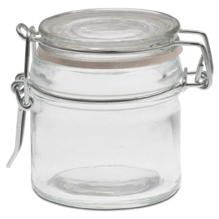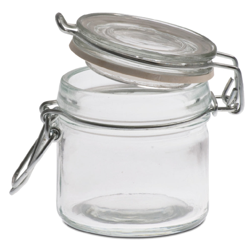 The JB Prince R868 Mason Jar is a compact and versatile glass container, ideal for both professional and home use. With a 3 oz. capacity, this jar is perfect for storing a variety of small items, from spices to homemade preserves. Measuring 2-4/5 inches in diameter and 2-3/4 inches in height, the round shape makes it easy to store or display in any setting. The jar features a bail wire closure system, ensuring a secure seal to keep contents fresh while adding a classic touch to its design. A rubber gasket enhances the airtight seal, making it suitable for preserving delicate ingredients. The transparent glass construction provides a clear view of the contents, aiding in quick identification and inventory management. This mason jar is not only functional but also adds an aesthetic appeal to any kitchen or pantry. Its compact size and secure sealing mechanism make it an excellent choice for culinary professionals looking for reliable storage solutions, as well as for individuals interested in DIY projects or personalized gifting. The JB Prince R868 Mason Jar embodies practicality and style, meeting diverse needs across various market segments within the culinary and home storage industries.