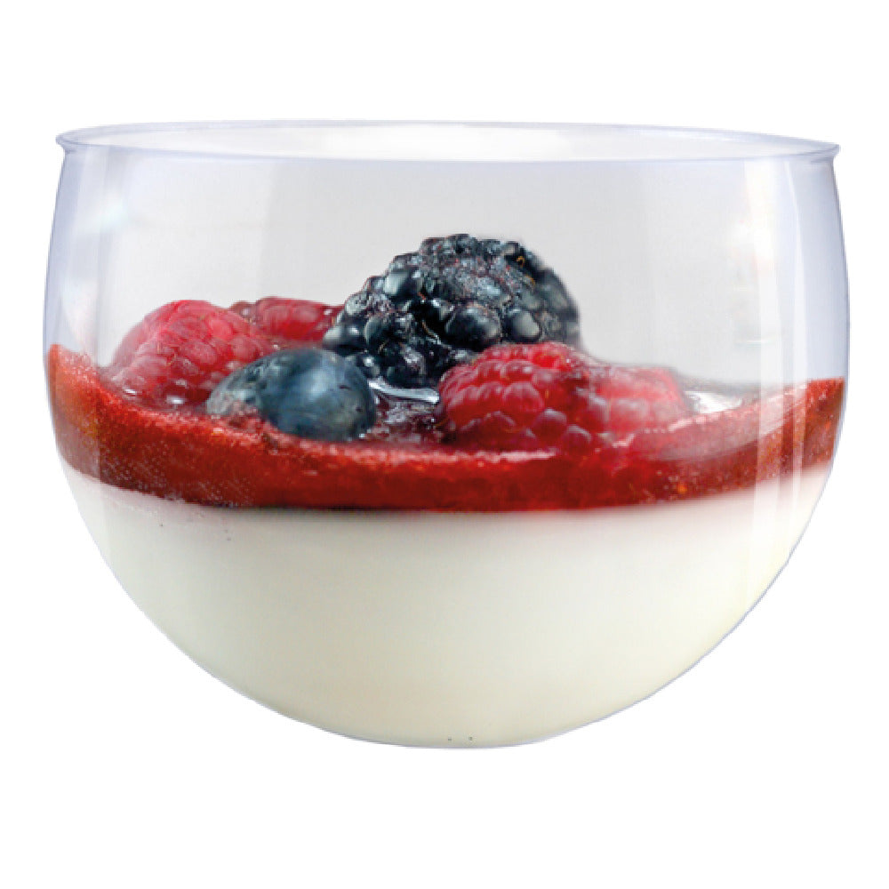 The JB Prince RB111 Comatec Disposable Loop Bowl 6-3/4 oz. is a practical and versatile solution for various dining and food service applications, crafted from transparent plastic. With dimensions of 3 inches in diameter and a height of 2-1/5 inches, this bowl is designed to provide both functionality and aesthetic appeal. Each pack contains 100 of these disposable bowls, making them ideal for large gatherings, catering events, or any situation where ease of cleanup is a priority. The transparent nature of the plastic allows for an elegant presentation of food, enhancing the dining experience by showcasing its contents. This makes it particularly useful in sectors such as catering, event management, and hospitality, where presentation is key. The JB Prince RB111 Comatec Disposable Loop Bowl is also a great fit for culinary professionals and restaurateurs who require a reliable and stylish serving option that doesn't compromise on convenience. Its size and capacity are perfect for serving appetizers, desserts, or side dishes, providing a unique combination of practicality and elegance. The disposable nature adds to its appeal by minimizing the need for post-event cleanup, thus saving time and labor costs.