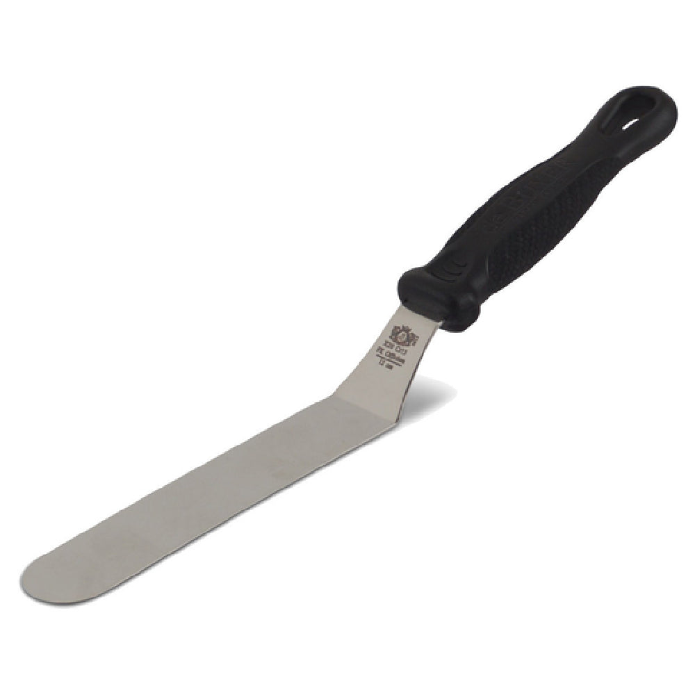 The JB Prince U136 12 FKOfficium Pastry Spatula 4-7/10" Round is an essential tool for pastry chefs and baking enthusiasts, designed with precision and durability in mind. This pastry spatula features a 4-7/10" round blade crafted from high-quality stainless steel, ensuring longevity and resistance to corrosion, making it ideal for both professional and home kitchens. The spatula is equipped with a polyamide handle reinforced with fiberglass, providing superior strength and a comfortable grip. The handle's design includes a convenient hanging hole for easy storage, enhancing the functionality of your kitchen workspace. Its dishwasher-safe attribute simplifies the cleaning process, making it a practical choice for busy culinary environments. The sleek black handle adds a touch of elegance to its utilitarian design. This spatula is a versatile tool suitable for various tasks such as spreading, smoothing, and lifting delicate pastries. Its robust construction and thoughtful design elements ensure it meets the rigorous demands of baking professionals and enthusiasts alike. The JB Prince U136 12 FKOfficium Pastry Spatula is a valuable addition to any culinary toolkit, combining functionality with a sophisticated design to support a wide range of pastry applications.