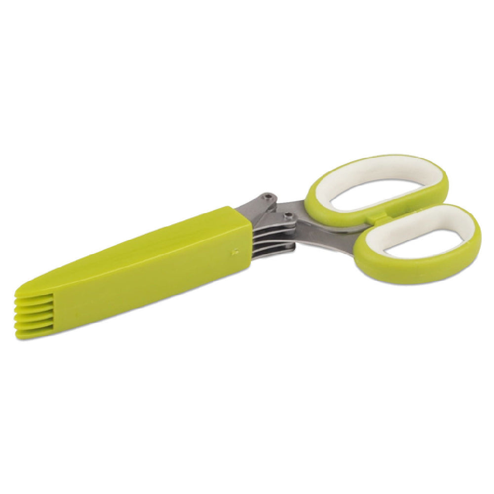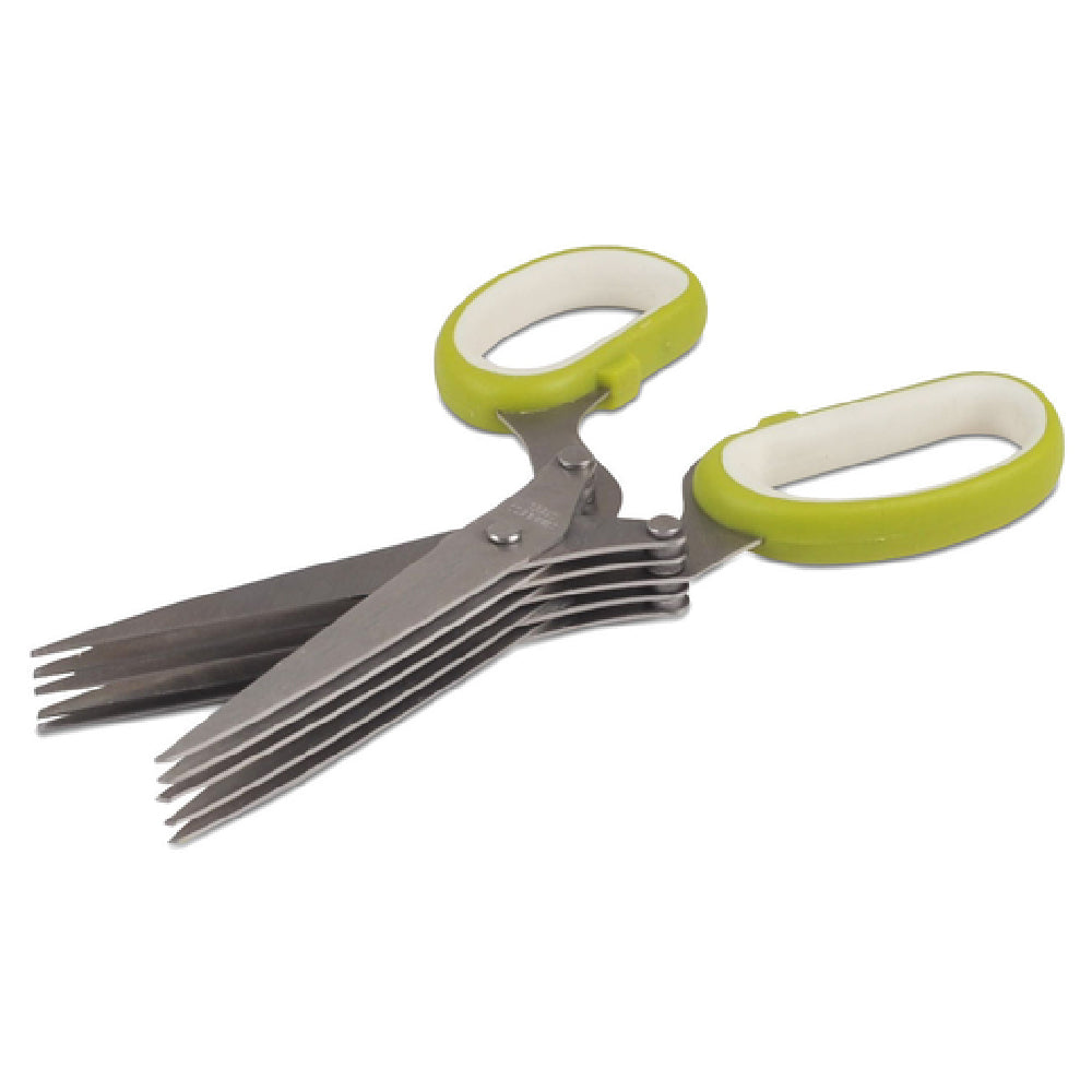 The JB Prince U143 Herb Scissors - 3"L (5) Blade is an innovative kitchen tool that caters to a variety of culinary needs with its advanced design and functionality. Featuring a compact 3-inch length, these herb scissors are equipped with five stainless steel blades, ensuring precision and efficiency in cutting herbs and small greens. The stainless steel construction promotes durability and resistance to rust, making it an ideal choice for both professional chefs and home cooks who value longevity in their kitchen tools. The scissors come with a plastic handle designed for a comfortable grip, with an elegant white and green color combination that adds a touch of modernity to your kitchen ensemble. Additionally, the JB Prince U143 Herb Scissors include a protective cover, ensuring safe storage and preserving blade sharpness when not in use. This makes it a practical accessory for those who frequently work with herbs and desire a tool that delivers consistent results. These herb scissors are particularly beneficial in fast-paced commercial settings where time and precision are paramount, as well as in home kitchens where ease of use and maintenance are valued. The JB Prince U143 Herb Scissors represent a blend of functionality and design, tailored to meet the demands of diverse culinary environments.