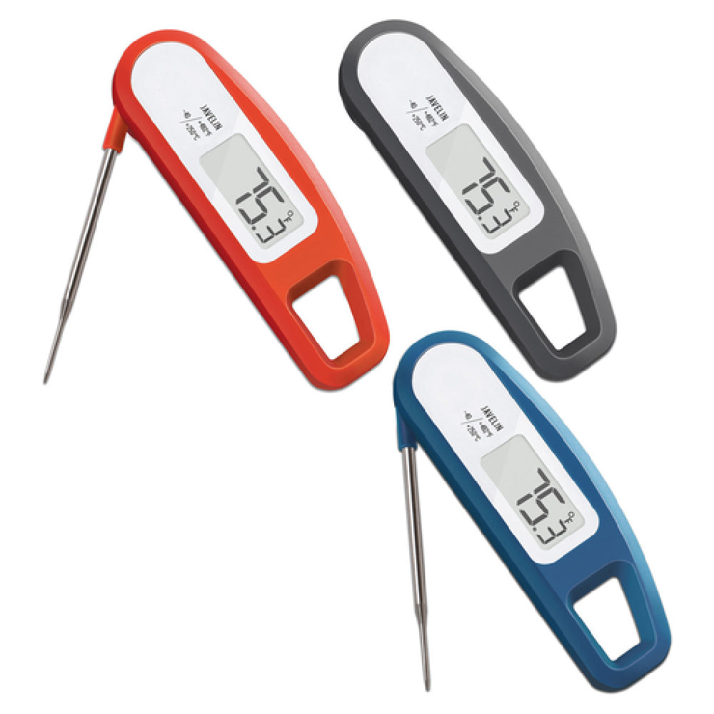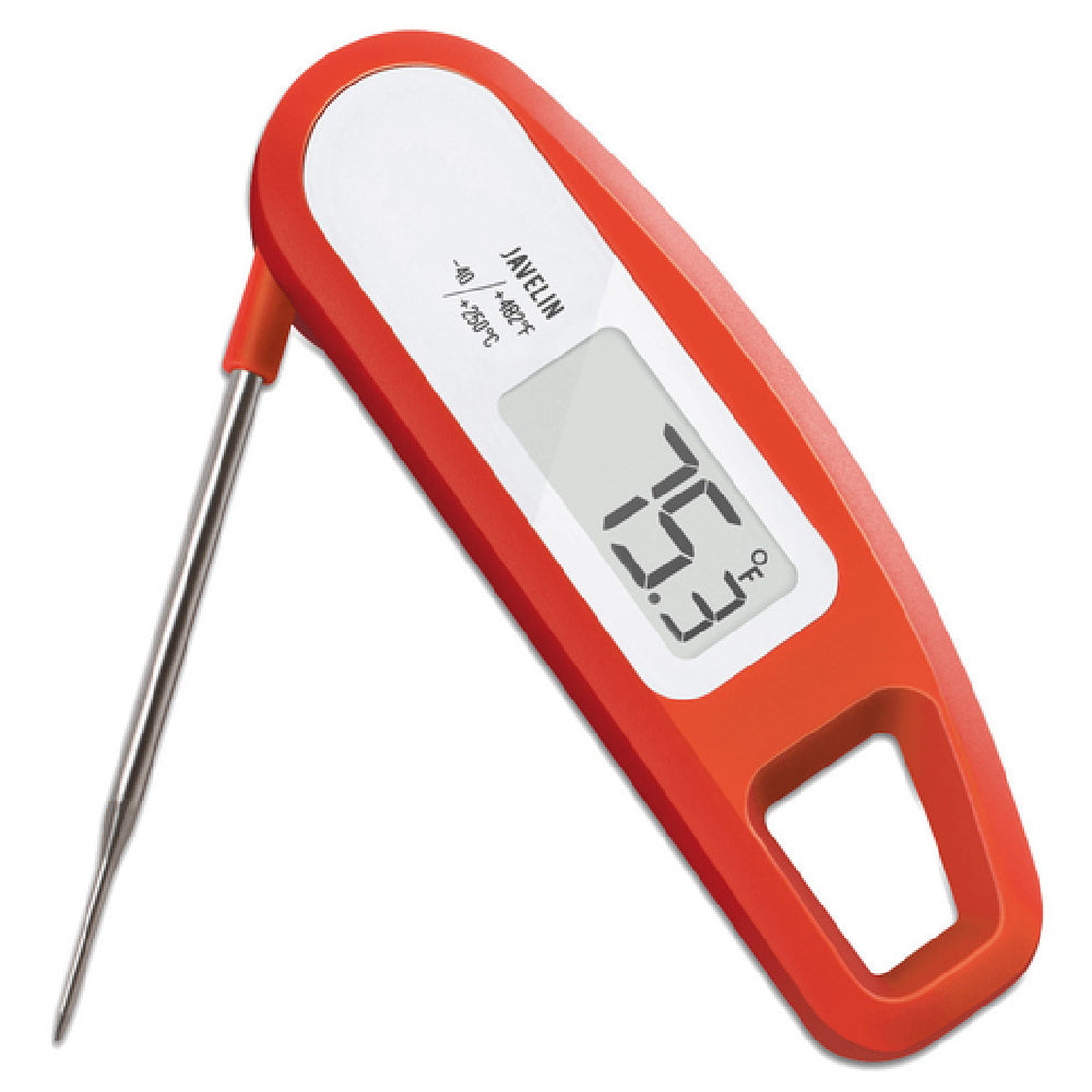 The JB Prince U152 C Lavatools Javelin Thermometer is a precision instrument designed for a wide range of culinary applications, offering a temperature range from -40°F to 482°F (-40°C to 250°C). Featuring a folding stainless steel probe, this thermometer ensures accurate temperature readings, making it an essential tool for chefs and food enthusiasts alike. The device's antimicrobial exterior helps maintain hygiene standards, while its splash-resistant construction adds durability in various kitchen environments. The magnetic back allows for convenient attachment to metallic surfaces, providing easy accessibility during food preparation. Crafted with a chipotle-colored plastic casing, the Lavatools Javelin Thermometer is NSF certified, ensuring it meets public health and safety standards. Its compact and user-friendly design makes it suitable for both professional kitchens and home use, offering reliable performance and versatility. This thermometer is well-suited for tasks ranging from grilling and baking to candy making, accommodating the needs of diverse market segments within the food industry.