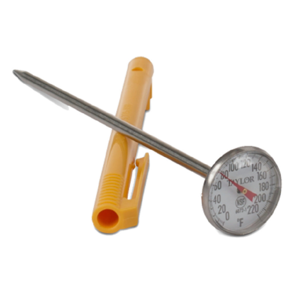 The JB Prince U504 Taylor Pocket Thermometer is a precision instrument designed for culinary professionals and enthusiasts alike, featuring a compact 1-inch diameter dial and a 5-inch long probe. This thermometer is capable of measuring temperatures ranging from 0 to 220°F, making it versatile for a wide range of cooking applications, from sous vide to grilling. Constructed from stainless steel, this thermometer ensures durability and long-term use in demanding kitchen environments. It comes with a plastic holder for safe storage and portability, and the bright yellow accent ensures visibility and easy identification in a busy kitchen. The adjustable reading feature offers precise temperature monitoring, crucial for achieving perfect results in any culinary endeavor. Whether you are a professional chef in a bustling restaurant kitchen or a home cook perfecting your craft, the JB Prince U504 Taylor Pocket Thermometer provides reliable and accurate temperature readings that are essential for food safety and quality. Its compact size and robust construction make it an ideal companion for chefs on the move or in need of a quick and reliable temperature check during service or preparation. This thermometer represents a blend of precision and practicality, meeting the diverse needs of the culinary industry.