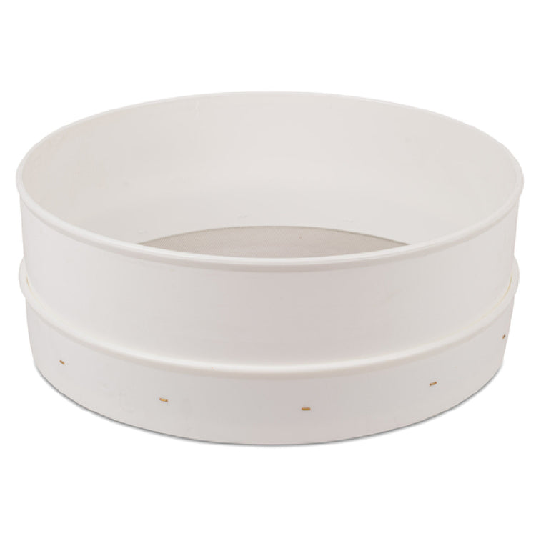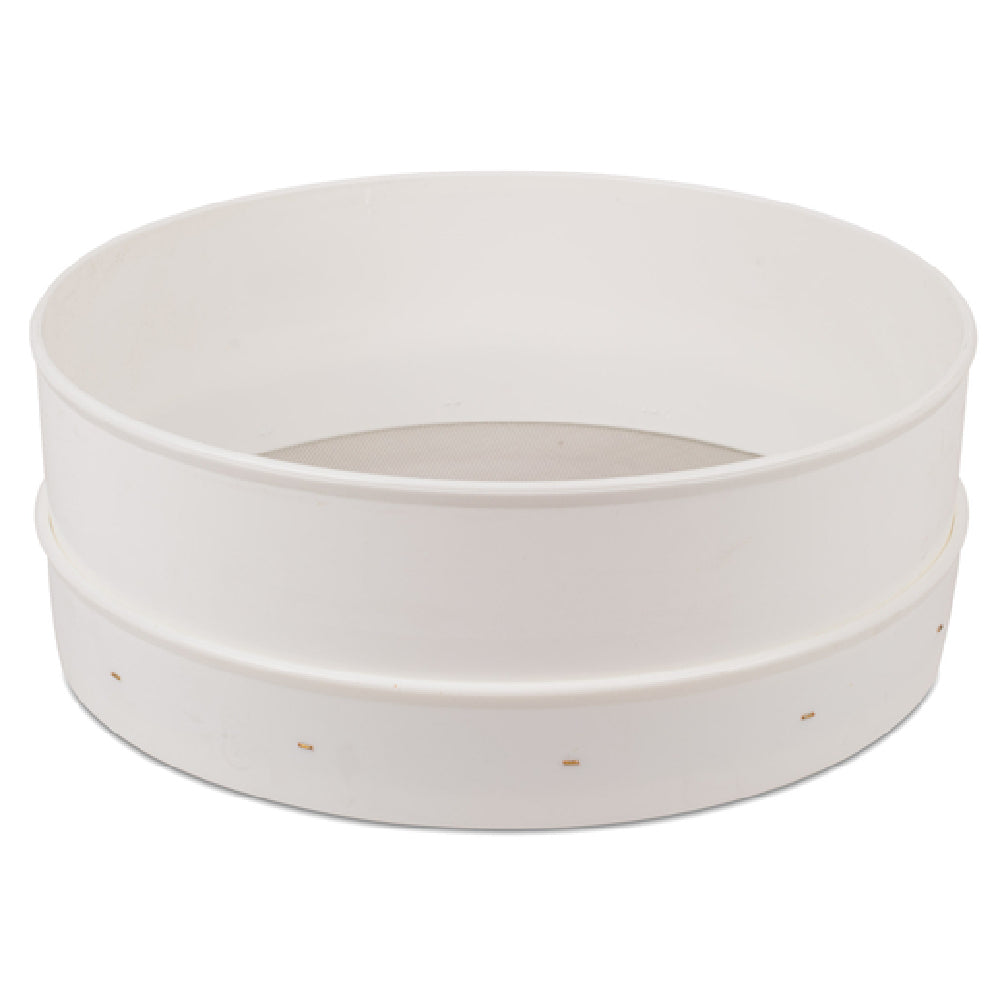 JB Prince U641 Flour Sieve 12" Dia. X 4-1/3"H Fine Mesh is a meticulously designed kitchen tool crafted for professionals and baking enthusiasts. Featuring a fine mesh made from high-quality stainless steel wire, this sieve ensures the smoothest sift, free of clumps, providing superior results in baking and cooking applications. The sieve's substantial 12-inch diameter allows for efficient processing of larger volumes of flour, while its 4-1/3-inch height provides ample space for the flour to move through the fine mesh easily. Housed in a durable polycarbonate frame, the sieve offers a lightweight yet robust construction that withstands the rigors of regular use. The white frame not only adds a sleek aesthetic but also highlights the sieve's cleanliness and readiness for use. This product is particularly valuable to pastry chefs, bakers, and culinary professionals who require precision in their sifting process to achieve the finest textures in their doughs and batters. Its design ensures ease of use and maintenance, making the JB Prince U641 Flour Sieve an essential tool for any kitchen focused on quality and efficiency.