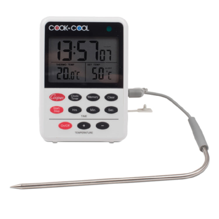 The JB Prince U729 Cooper Electronic Thermometer Timer And Clock is a multifunctional device designed for precision and versatility in temperature monitoring. Measuring 4 inches in height and 2-1/2 inches in width, this digital thermometer stands out for its compact and efficient design, making it suitable for various culinary and laboratory environments. Equipped with a 3-foot stainless steel wire and probe, it facilitates a wide temperature range monitoring from 32 to 392 degrees Fahrenheit, ensuring accurate readings for a multitude of applications. The magnetic back enhances its usability by allowing it to be conveniently placed on metal surfaces, providing easy access and visibility. Constructed with a durable combination of plastic and stainless steel in a sleek black finish, the JB Prince U729 is both robust and aesthetically pleasing. This device comes with batteries included, ensuring it is ready for immediate use. It serves not only as a thermometer but also incorporates a timer and clock function, offering a comprehensive tool for professionals requiring precise time and temperature management. Its robust construction and multifunctional capabilities make it an indispensable tool for chefs, laboratory technicians, and other professionals who demand accuracy and reliability in their daily tasks.