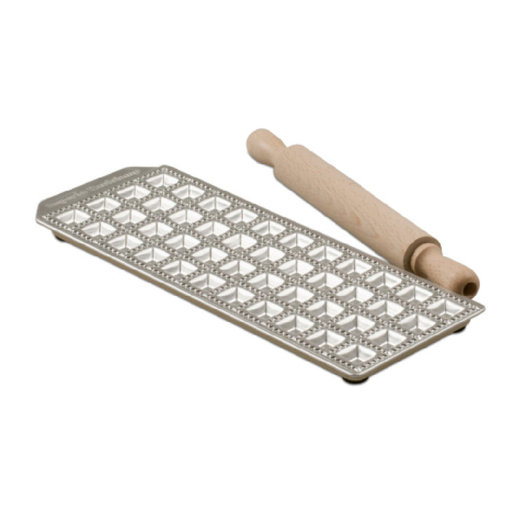 The JB Prince U955 Imperia Ravioli Maker is a specialized kitchen tool designed for culinary professionals who demand precision and efficiency in ravioli production. Measuring 4-1/8 inches in length and 5-1/2 inches in width, this ravioli maker is compact yet highly effective, featuring 44 individual cavities that form perfect 1-inch square raviolis. The robust construction comprises pressed aluminum set on an enameled steel base, ensuring durability and stability during use. The inclusion of a wood rolling pin enhances its functionality, allowing users to exert the right amount of pressure for optimal dough shaping. Additionally, the ravioli maker is equipped with rubber feet, which prevent slipping and protect work surfaces from scratches. Ideal for commercial kitchens, artisanal pasta shops, and culinary schools, the JB Prince U955 Imperia Ravioli Maker offers professional-grade quality for high-volume production without compromising on precision or ease of use. Its thoughtful design and engineering cater to the needs of chefs and pasta aficionados, making it an indispensable tool for creating consistent, high-quality ravioli efficiently. This product is a testament to JB Prince's commitment to providing reliable and innovative culinary equipment tailored to the exacting standards of the foodservice industry.