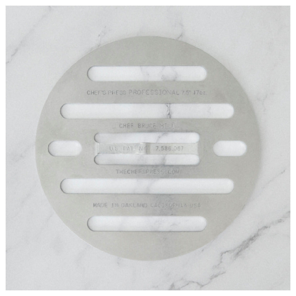 JB Prince, UA269, Chefs Press, 7.5"dia, 17 oz., round, dishwasher safe, 11 gauge stainless steel, Made in USA