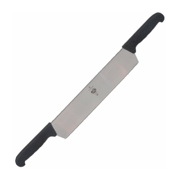 The JB Prince V805 12PL Victorinox Double-Handled Cheese Knife - 12" Stainless Steel Blade is a highly specialized kitchen tool designed to meet the rigorous demands of both professional and home-based cheese enthusiasts. Featuring a 12-inch stainless steel blade, this knife is engineered for precision and durability, allowing for smooth and efficient slicing of various cheeses. The double-handled design provides superior control and leverage, making it particularly suited for cutting through large blocks of cheese with ease. The ergonomic plastic handles are crafted for comfort and stability, ensuring a firm grip during use. This knife is an invaluable asset in culinary environments where precision and efficiency are paramount, such as artisanal cheese shops, upscale restaurants, and catering services. Its robust construction and thoughtful design guarantee longevity and performance, making it a preferred choice for those who take their cheese presentation and preparation seriously. Whether used in a bustling professional kitchen or a well-appointed home setting, the JB Prince V805 12PL Victorinox Double-Handled Cheese Knife stands out for its ability to deliver consistent, high-quality results, enhancing the overall experience of cheese slicing and serving.