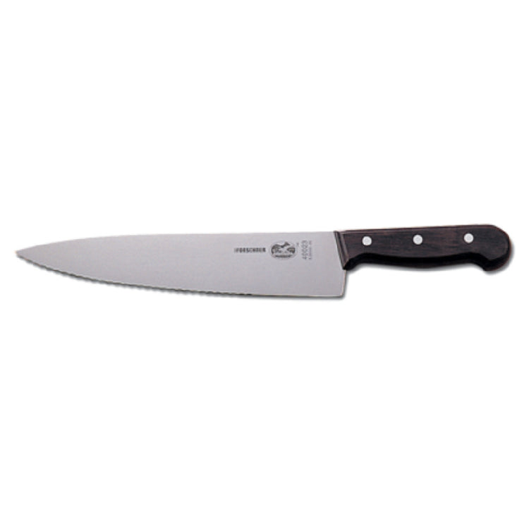 The JB Prince V813 7.5 Victorinox Chef's Knife 7-1/2" Serrated is a precision-crafted culinary tool designed for professional chefs and kitchen enthusiasts alike. Featuring a 7-1/2 inch serrated blade, this knife is adept at slicing through a variety of ingredients with ease. The blade is stamped from high carbon stainless steel, ensuring durability and resistance to corrosion, while maintaining a sharp edge over time. Equipped with a rosewood handle, the knife offers an ergonomic grip, combining functionality with an elegant aesthetic. Proudly manufactured in Switzerland, this chef's knife is available for purchase exclusively in the United States. The JB Prince V813 7.5 stands out in the market for its superior craftsmanship and materials, catering to both high-end culinary professionals and home cooks who appreciate quality cutlery. Its serrated edge is particularly beneficial for cutting through tough-skinned fruits, vegetables, and crusty bread, making it a versatile addition to any kitchen. The combination of the knife's technical specifications and its specialized design makes it a valuable tool for achieving precision in food preparation.