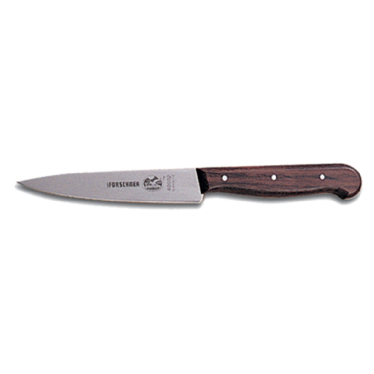 The JB Prince V815 Victorinox Kitchen Knife 4-3/4" Straight is a precision-crafted culinary instrument, designed to meet the high standards of professional chefs and cooking enthusiasts alike. This knife features a 4-3/4" straight blade, meticulously stamped from high carbon stainless steel, providing exceptional sharpness and durability through numerous cutting tasks. Renowned for its manufacturing excellence, this kitchen knife is made in Switzerland, a country synonymous with quality craftsmanship in cutlery. The rosewood handle not only offers an elegant aesthetic but also ensures a comfortable grip for extended use in busy kitchen environments. Exclusively available for sale in the US, this knife stands out for its unique blend of tradition and innovation, appealing to culinary experts in both domestic and professional settings. The JB Prince V815 Victorinox Kitchen Knife is ideal for those who value precision and reliability, making it a favored choice among chefs in various segments of the food industry, including restaurants, catering businesses, and home kitchens. Its high carbon composition ensures long-lasting sharpness, while the ergonomic design supports effortless handling, setting a standard in culinary tools for its superior functionality and timeless design.