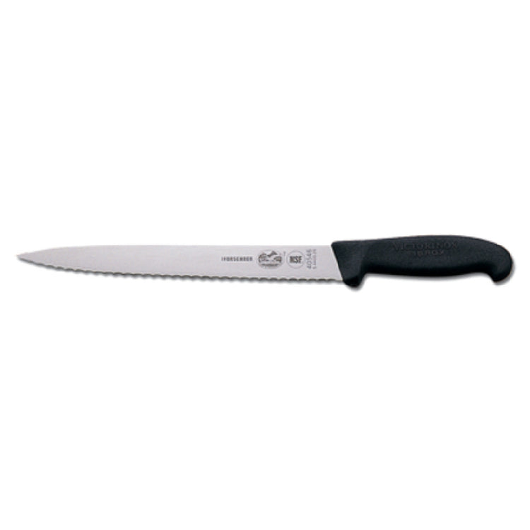 The JB Prince V818 10PL Victorinox Slicer 10" Pointed is a precision cutting tool, perfect for culinary professionals and enthusiasts alike. This slicer is characterized by its 10-inch pointed, serrated blade, offering unparalleled slicing efficiency and precision. The blade is crafted from high carbon stainless steel, known for its exceptional durability and resistance to corrosion, ensuring a long-lasting sharp edge. The stamped construction of the blade provides a lightweight feel, enhancing maneuverability and control during use. Complementing the blade is a black plastic handle, designed for a comfortable and secure grip, reducing hand fatigue during extended use. Proudly made in Switzerland, this slicer upholds a tradition of superior Swiss craftsmanship. It is NSF certified, highlighting its compliance with rigorous public health and safety standards, making it suitable for professional kitchen environments. The JB Prince V818 10PL is exclusively sold in the US, catering to a specific market segment that values quality and exclusivity. This slicer is an indispensable tool for achieving precise, clean cuts in various culinary applications, making it a valuable asset in both professional and home kitchens.