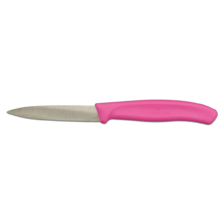 The JB Prince V861 P Victorinox Paring Knife 3-1/4" spear point is a precision instrument designed for professional and home chefs alike, boasting a length of 3-1/4 inches for maneuverability and precision in intricate cutting tasks. Crafted with high carbon stainless steel, this knife ensures durability and resistance to corrosion, making it suitable for prolonged kitchen use. The spear point blade is stamped, highlighting its lightweight nature, which facilitates ease of use in peeling, slicing, and detailing tasks. A standout feature of this paring knife is its vibrant pink plastic handle, which not only provides a secure grip and comfort during extended use but also adds a touch of personality to your kitchen tools. This knife is available exclusively in the United States, emphasizing its specialty status within the culinary market. The JB Prince V861 P is an ideal choice for culinary professionals seeking reliable and efficient tools, as well as home cooks who appreciate a blend of functionality and style. Its high-quality construction and unique design make it a valuable addition to any cutlery collection, catering to a wide range of users in the culinary industry.
