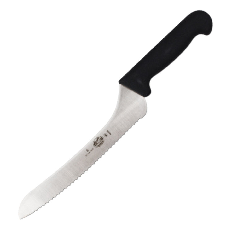 The JB Prince V864 9PL Victorinox Knife - 9" Offset is a precision instrument designed for culinary professionals, featuring a 9-inch wavy edge blade made from high-quality stainless steel. This offset knife stands out with its unique design, which allows for enhanced cutting efficiency and safety by keeping the user's hand clear of the cutting surface. The robust construction of the blade ensures durability and longevity, making it a reliable tool for rigorous kitchen environments. The knife's handle is crafted from durable plastic, providing an ergonomic grip that reduces hand fatigue during prolonged use. The sleek black handle not only complements the knife's aesthetic appeal but also offers a secure hold, even when wet. Designed for exclusive distribution within the United States, this knife caters to a variety of market segments, including professional chefs, culinary schools, and foodservice industries. Its specialized design and material composition make it an ideal choice for tasks requiring precision and consistency, such as slicing bread and delicate pastries. The JB Prince V864 9PL Victorinox Knife exemplifies a blend of functionality and design, tailored to meet the needs of demanding culinary professionals seeking reliable performance in a kitchen essential.