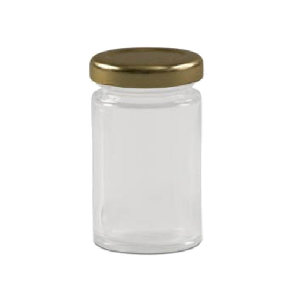 The JB Prince X406 Mini Glass Jar 2.4 oz. with Gold Plastic Screw Top Cap is a versatile packaging solution catering to diverse segments within the food, cosmetics, and craft industries. This transparent glass jar holds a capacity of 2.4 ounces, providing an ideal size for storing small quantities of gourmet spices, artisanal sauces, or handcrafted beauty products. The inclusion of a gold plastic screw top cap not only ensures a secure seal to preserve the freshness of its contents but also adds a touch of elegance, making it suitable for premium product lines. Constructed from clear glass, this mini jar offers excellent visibility, allowing consumers to easily identify the contents while adding an aesthetic appeal to product displays. Its compact size makes it perfect for sample sizes or gift sets, offering businesses a cost-effective yet stylish packaging option. The JB Prince X406 Mini Glass Jar is particularly advantageous for markets that require precise portion control or seek to enhance the presentation of high-quality goods, ensuring versatility and practicality across a range of applications.