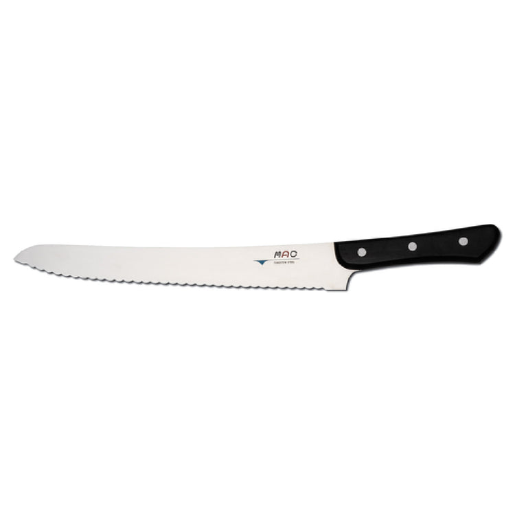 The JB Prince Y312 10.5 Mac Slicer is a precision kitchen tool designed for those who demand accuracy and efficiency in their culinary endeavors. Featuring a 10-1/2" stamped blade, this slicer provides the ideal length for a variety of slicing tasks in both professional and home kitchen environments. The blade is crafted from high carbon stainless steel, known for its excellent edge retention and resistance to corrosion, ensuring longevity and consistent performance. Its serrated edge enhances cutting efficiency, making it particularly effective for slicing through products with tough exteriors and soft interiors, such as bread or citrus fruits. Complementing its high-quality blade, the JB Prince Y312 features a wood handle, offering both a comfortable grip and a classic aesthetic appeal. The black wood handle not only adds to the knife's elegant appearance but also provides durability and ease of maintenance. This Mac Slicer is tailored for chefs and home cooks who value reliability and precision in their kitchen tools, making it a versatile addition to any culinary setting. Its thoughtful design and robust materials underscore its capability to deliver consistent, high-performance cutting results across a range of applications.