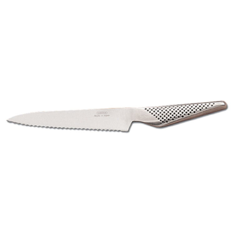 The JB Prince Y537 Global Utility Knife 6" Serrated is a versatile culinary tool engineered for precision and durability. Crafted from high-carbon stainless steel, this knife offers exceptional strength and resistance to corrosion, ensuring longevity in demanding kitchen environments. The 6-inch serrated blade is meticulously designed to slice through tough-skinned fruits and vegetables, as well as crusty breads, with ease and precision. Made in Japan, this knife exemplifies the superior craftsmanship and attention to detail synonymous with Japanese cutlery. Its ergonomic handle provides a comfortable grip, reducing fatigue during extended use, making it suitable for both professional chefs and home cooks. This utility knife is an invaluable addition to any kitchen, offering a blend of functionality and elegance that caters to diverse culinary needs. Its compact size makes it ideal for tasks that require more control than a larger chef's knife can provide, while the serrated edge ensures clean cuts without tearing. The JB Prince Y537 Global Utility Knife is a testament to high-quality Japanese manufacturing, balancing aesthetic appeal with practical performance, and serving as a reliable partner for culinary enthusiasts across different market segments. Its precision and reliability make it a preferred choice for those seeking excellence in their kitchen tools.
