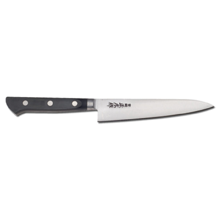The JB Prince Y601 Masahiro Utility Knife 6" Forged is a meticulously crafted tool that exemplifies precision and durability, making it a staple for both professional chefs and culinary enthusiasts. This utility knife features a 6-inch forged blade made from high-quality carbon steel, renowned for its sharpness and ease of re-sharpening, ideal for tackling a variety of kitchen tasks with finesse. The blade's craftsmanship ensures long-lasting performance, making it an essential addition to any kitchen. Complementing the blade is a sleek, black plastic handle, designed for a comfortable grip and enhanced control, which allows for precise cutting and ease of use. Made in Japan, this knife embodies the exceptional standards of Japanese knife-making, offering a harmonious balance of functionality and elegance. Its compact size and versatile design make it suitable for different segment markets, from professional culinary environments to home kitchens, where reliability and precision are paramount. The JB Prince Y601 Masahiro Utility Knife represents a blend of traditional craftsmanship and modern materials, ensuring it remains a valuable tool across various culinary applications, providing chefs with the dependability needed to execute intricate culinary techniques with confidence.