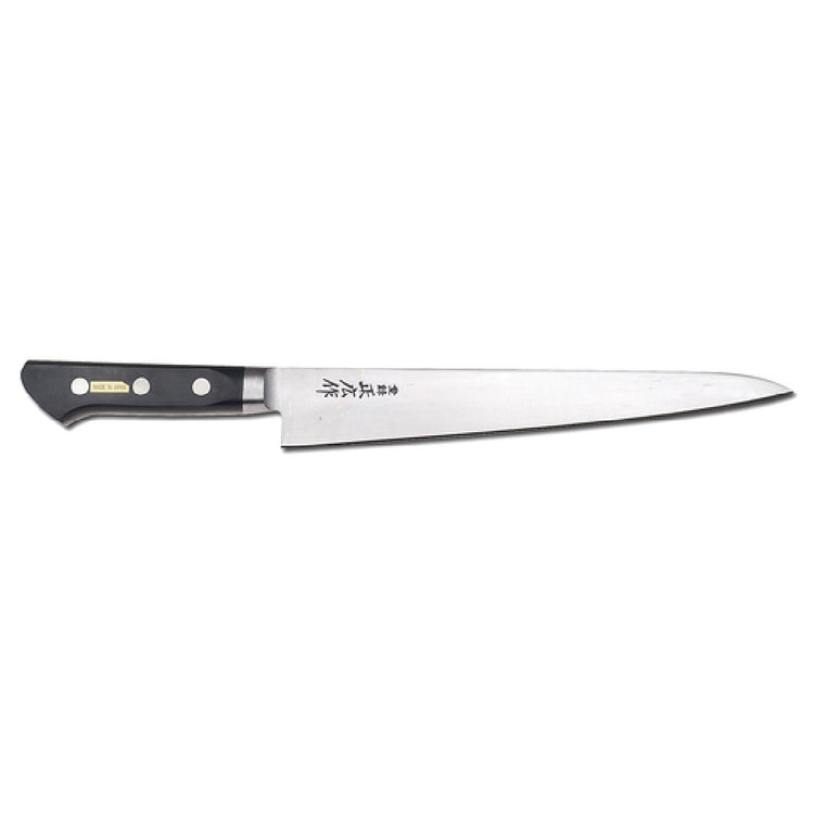 The JB Prince Y605 10.5 Masahiro Slicer (Sujihiki) - a 10-1/2" forged knife - is a precision instrument crafted for discerning chefs and culinary professionals. Featuring a smooth edge and constructed from high-quality carbon steel, this Japanese-made slicer ensures superior sharpness and durability, ideal for precise slicing tasks. The carbon steel blade not only provides exceptional cutting performance but also enhances the knife's longevity, maintaining its edge with proper care. A black plastic handle complements the blade, offering a comfortable and secure grip, enhancing safety and control during use. This combination of materials and craftsmanship makes the JB Prince Y605 10.5 Masahiro Slicer an essential tool for those in the culinary industry who demand precision and reliability. Its design is particularly suited for tasks that require long, clean cuts, fitting seamlessly into professional kitchens, gourmet settings, and home use where professional-grade tools are preferred. Whether used by chefs in bustling restaurant environments or cooking enthusiasts at home, this sujihiki slicer is engineered to meet the high standards expected by those who value traditional Japanese knife-making excellence.