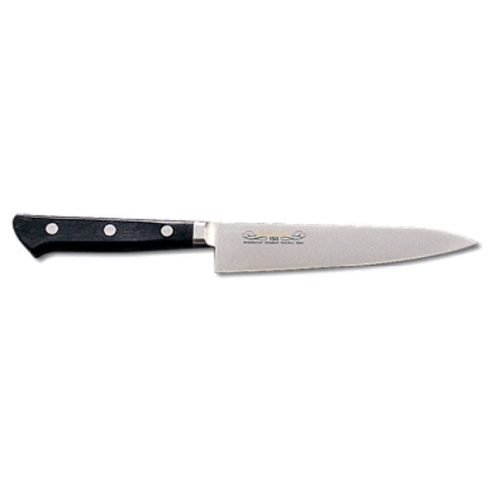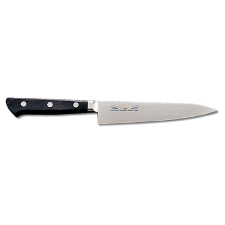 The JB Prince Y651 Masahiro Utility Knife 6" Forged is a precision-crafted tool designed for culinary professionals and enthusiasts who value quality and performance. Featuring a high-carbon stainless steel blade, this knife combines durability with exceptional sharpness, ideal for various kitchen tasks. The 6-inch blade length strikes a perfect balance between versatility and control, making it suitable for slicing, dicing, and chopping. The forged construction enhances the knife's strength and longevity, ensuring it withstands the rigors of everyday use. Complementing the superior blade is a beautifully crafted wood handle, which offers an ergonomic grip for comfortable handling. Finished in a classic black color, the handle not only provides a timeless aesthetic but also contributes to the knife's overall balance and precision. Proudly made in Japan, the JB Prince Y651 embodies the esteemed tradition of Japanese knife-making, known for its meticulous craftsmanship and attention to detail. This utility knife is an excellent choice for chefs seeking a reliable and elegantly designed tool for their kitchen, combining traditional Japanese artistry with modern functionality to meet the diverse needs of the culinary industry.