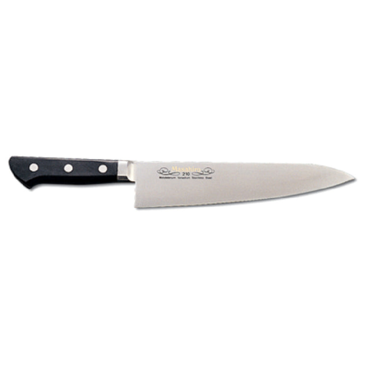 The JB Prince Y652 9.5 Masahiro Chef's Knife (Gyuto) 9-1/2" Forged is a meticulously crafted culinary tool that exemplifies precision and quality. This chef's knife features a forged, straight blade with a smooth edge, made from high carbon stainless steel, offering durability and exceptional sharpness. Measuring 9-1/2 inches, the blade is designed for versatility and efficiency in the kitchen, making it suitable for a variety of cutting tasks. The knife is equipped with a black wood handle, providing a comfortable grip and enhancing control during use. Its construction ensures a balanced and stable cutting experience, whether you're a professional chef or a home cooking enthusiast. Made in Japan, this knife reflects traditional craftsmanship and modern technology, making it a reliable choice for culinary professionals and hobbyists alike. The JB Prince Y652 9.5 Masahiro Chef's Knife is ideal for a range of market segments, including gourmet restaurants, catering services, and culinary schools, where precision, reliability, and high performance in kitchen tools are paramount. This knife's combination of craftsmanship and advanced materials makes it a valuable addition to any kitchen setting, offering the unique value of Japanese knife-making heritage in a practical and efficient design.