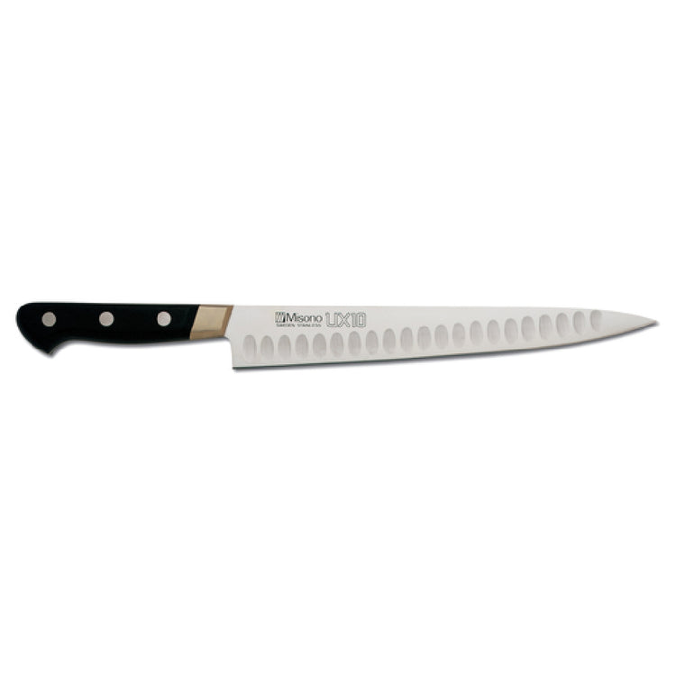 The JB Prince Y742 9.5 Misono UX-10 Chef's Slicer 9-1/2" is a precision-crafted culinary tool, distinguished by its high carbon stainless steel blade, which provides exceptional sharpness and durability. This forged knife features a hollow ground design, enhancing its ability to produce clean, precise cuts, making it an indispensable asset in professional and home kitchens alike. Measuring 9-1/2 inches, the blade offers an ideal balance between size and maneuverability, catering to a wide range of slicing tasks. The black wood handle not only adds an element of classic elegance but also ensures a comfortable, secure grip, reducing hand fatigue during extended use. The Misono UX-10 series is renowned for its superior craftsmanship and cutting-edge technology, appealing to chefs who demand performance and reliability. As a product of JB Prince, a trusted name in culinary tools, this chef's slicer embodies the perfect combination of tradition and innovation, tailored for those who seek precision in their culinary endeavors. Whether in the hands of a seasoned chef or an aspiring home cook, this slicer stands out as a versatile, valuable tool designed to meet the exacting standards of the culinary industry.